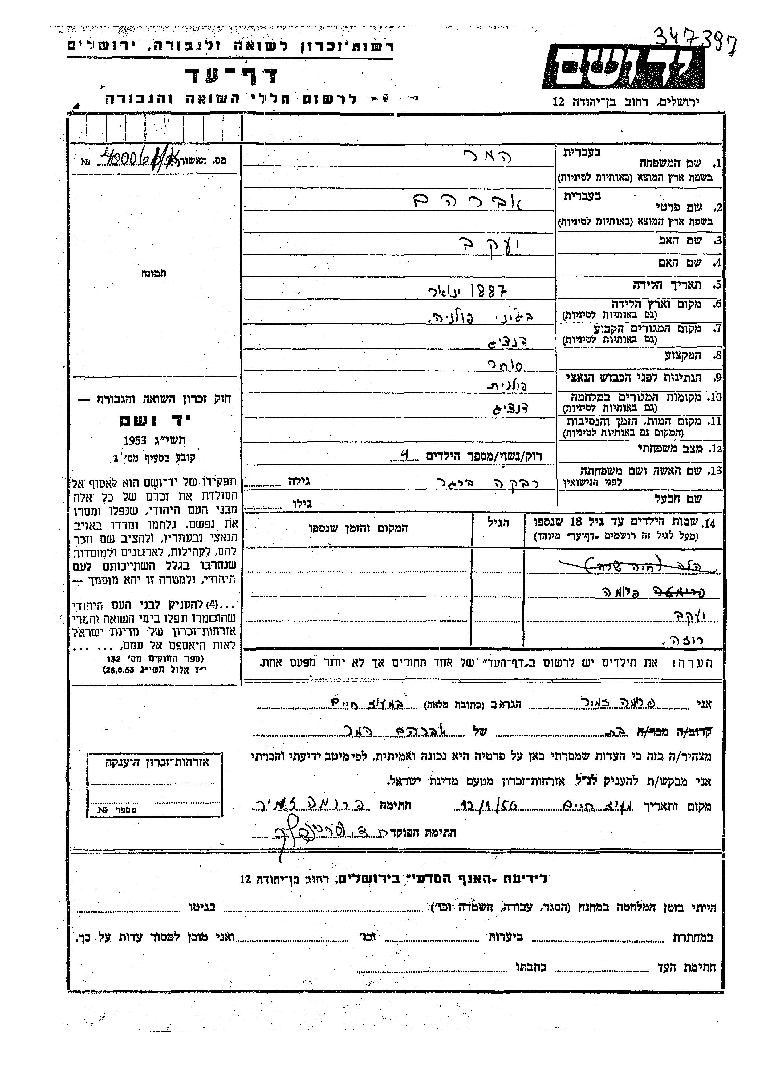 Yad Vashem - Colección conmemorativa de Hojas de Testimonio