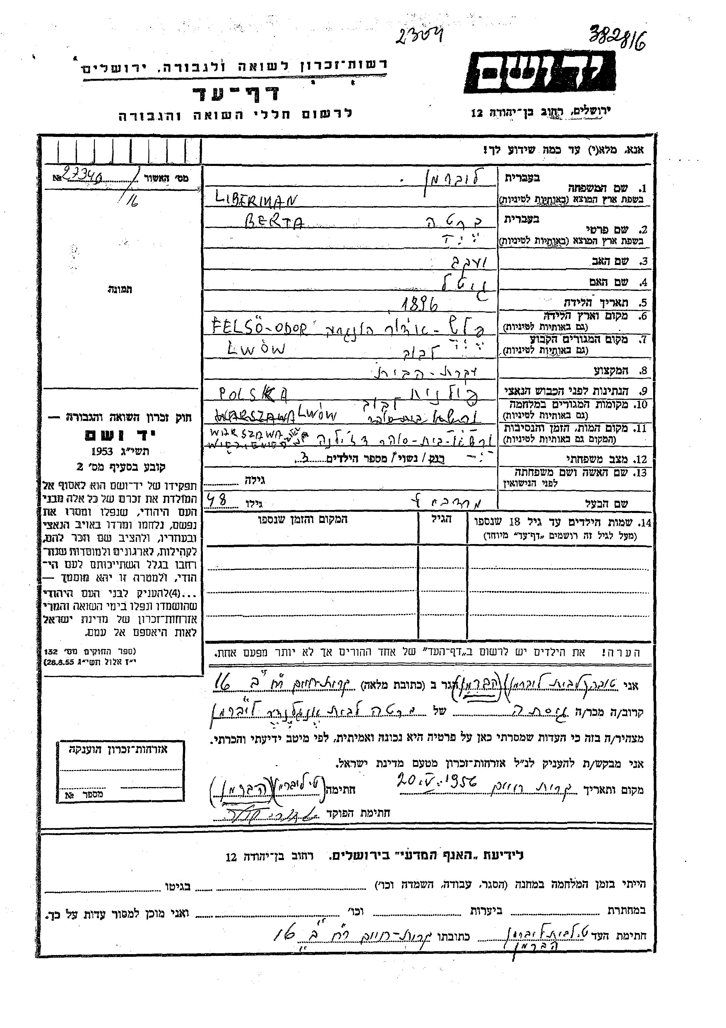 Liberman Berta 1896 Lwow, Polonia Hoja de Testimonio