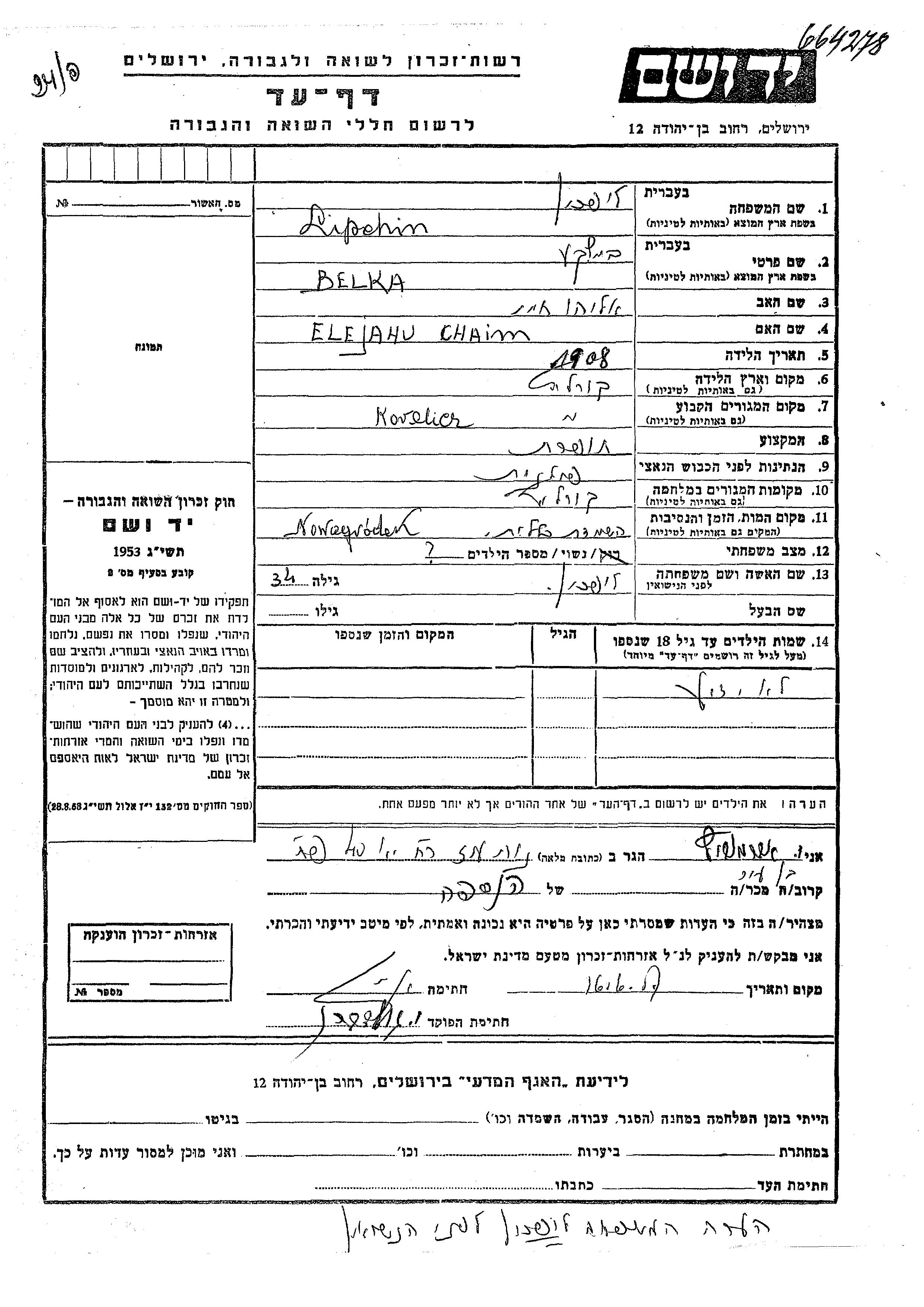 Lipchin Bela 1908 Korelicz, Polonia Hoja de Testimonio