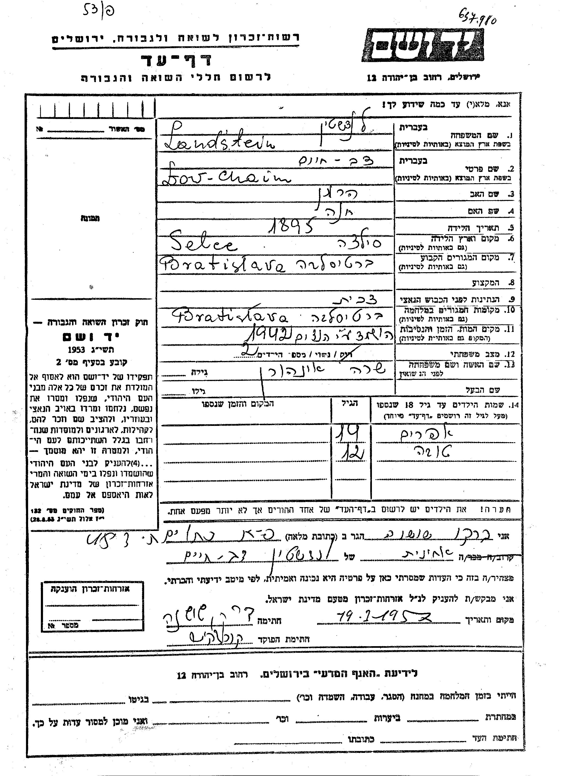 Landstein Tova Bratislava, Checoslovaquia Hoja de Testimonio