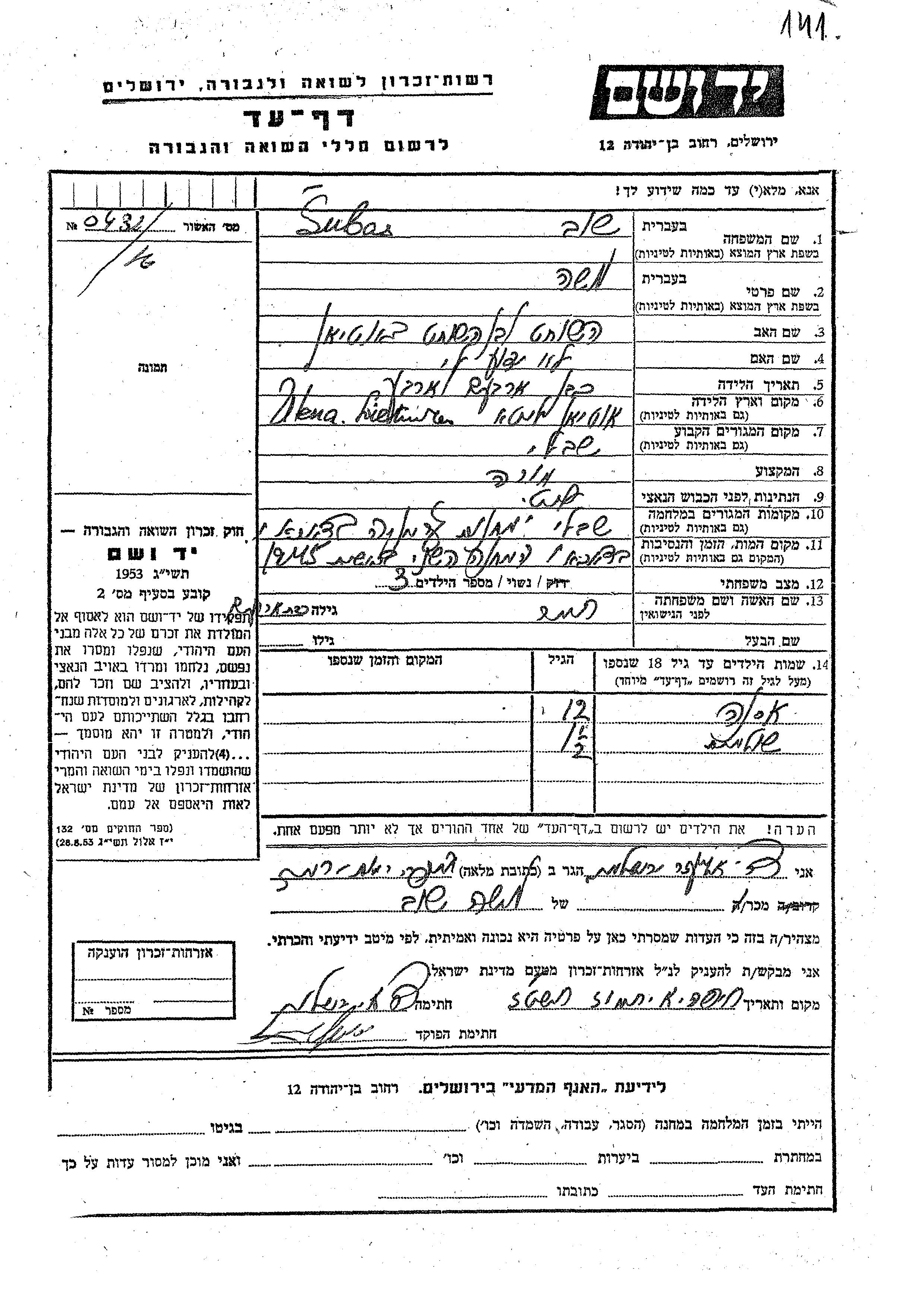 Subas Shulamit Savli, Lituania Hoja de Testimonio