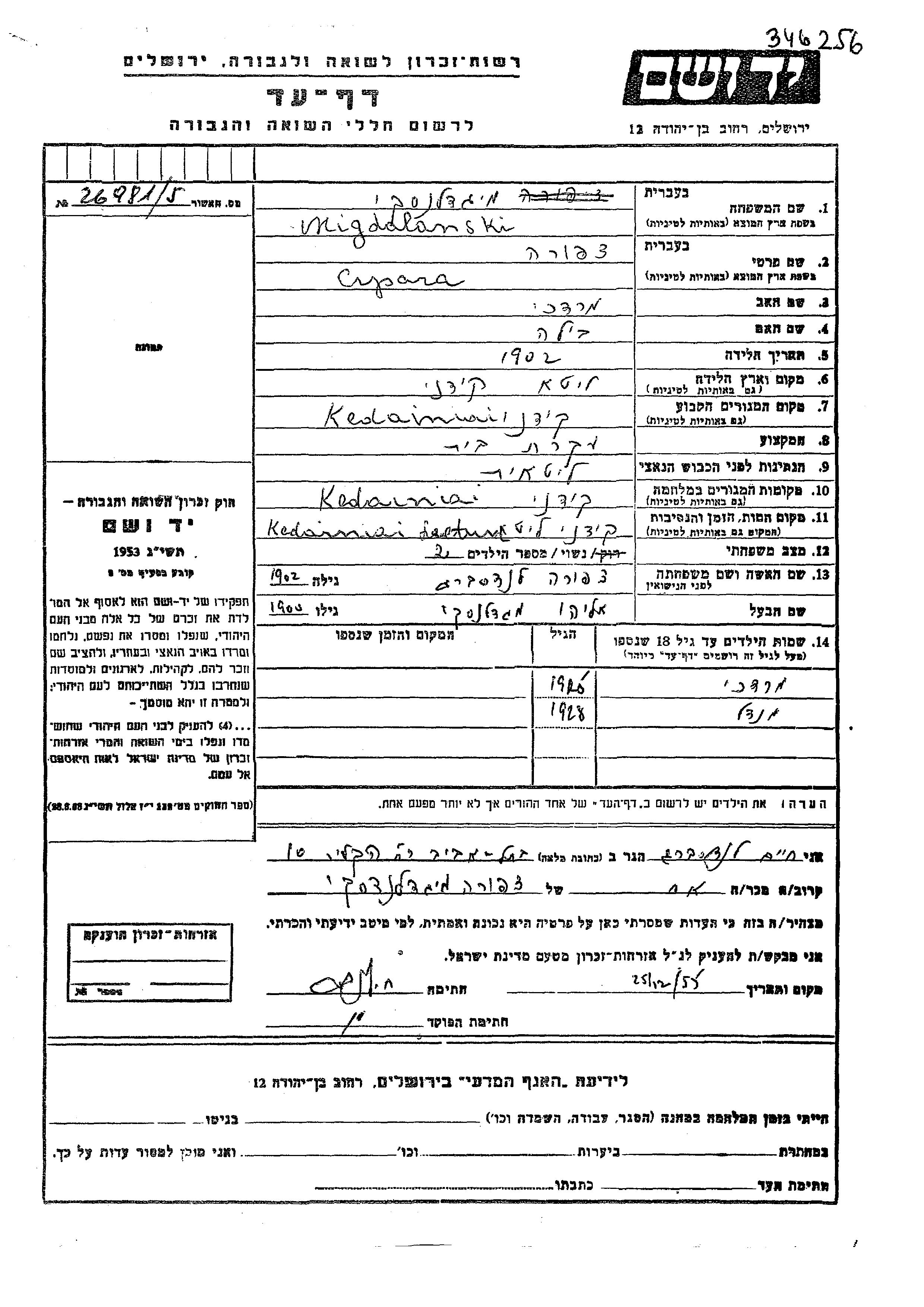 Migdalanski Mendel 1928 Kedainai, Lituania Hoja de Testimonio