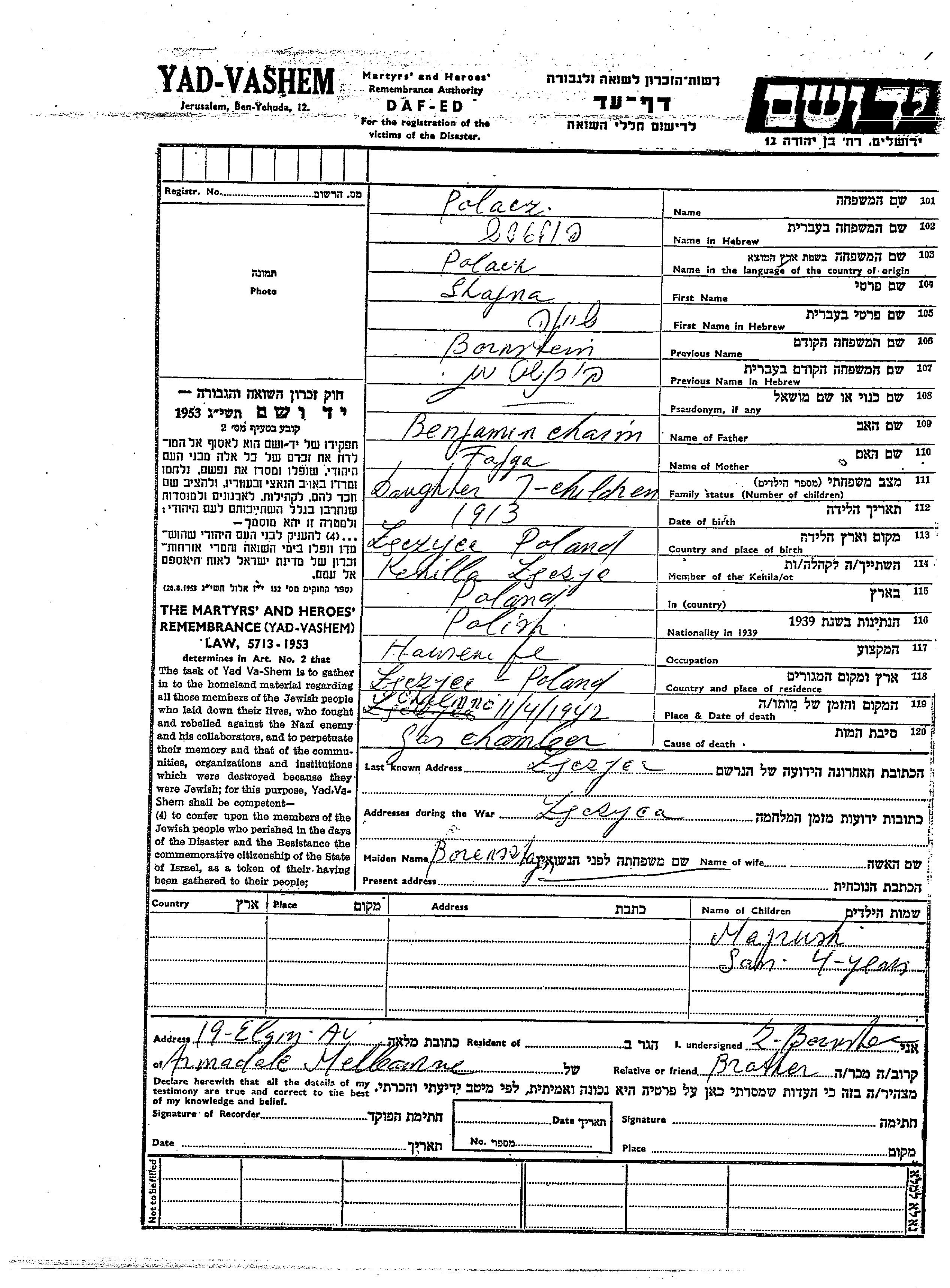 Majrush Polacz nació hijo de Shajna apellido de soltera Bornshtein. Era Niño. Antes de la segunda guerra mundial vivía en Leczyca, Polonia. Durante la guerra estuvo en Leczyca, Polonia.