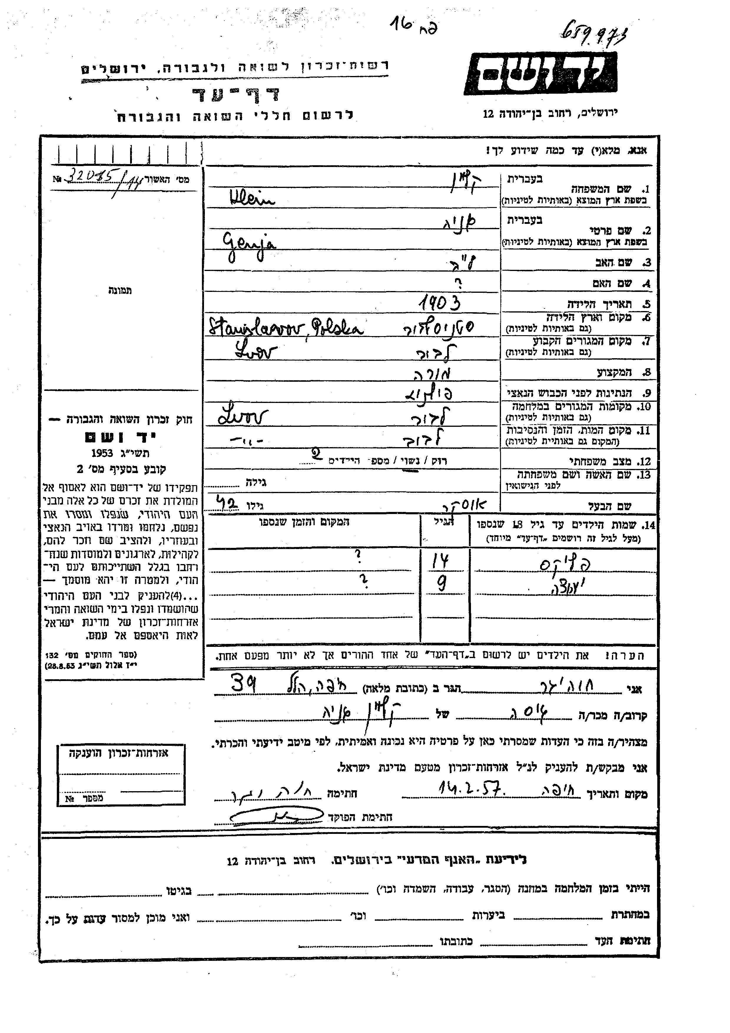 Klein Yehuda Lwow, Polonia Hoja de Testimonio