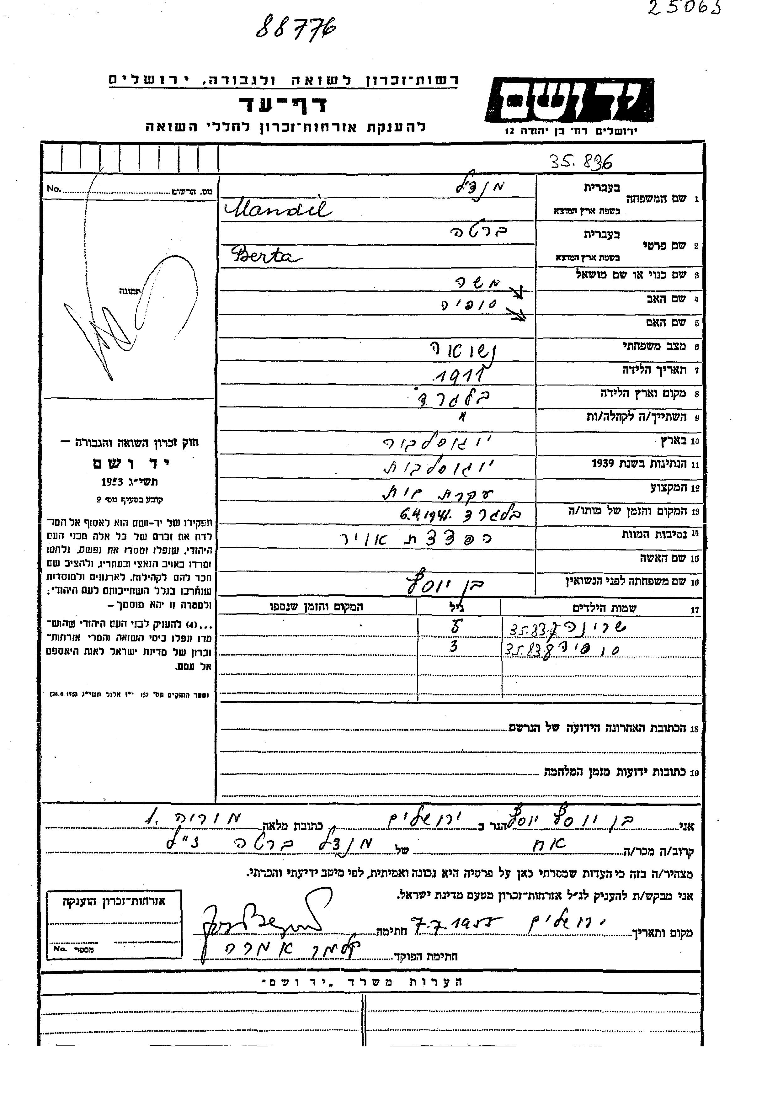 Mandil Sofia Belgrad, Yugoslavia Hoja de Testimonio