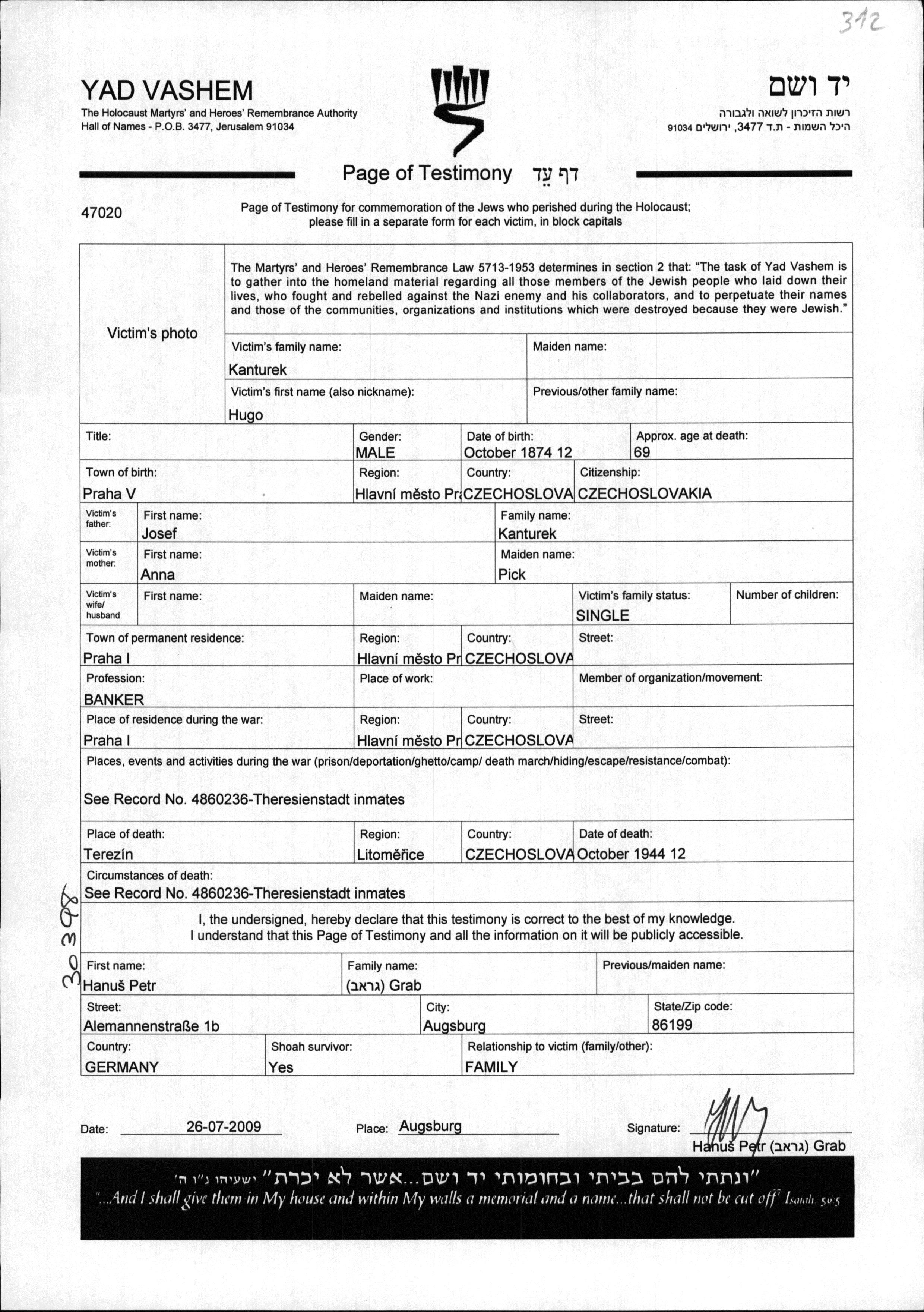 Hugo Kanturek nació en Praha, Checoslovaquia en 1874, hijo de Josef y Anna apellido de soltera Pick. Era Banquero y Soltero. Antes de la segunda guerra mundial vivía en Praha, Checoslovaquia. Durante la guerra estuvo en Praha, Checoslovaquia. Hugo fue asesinado durante la Shoá. Lugar de la muerte: Terezin, Checoslovaquia en 12/10/1944.