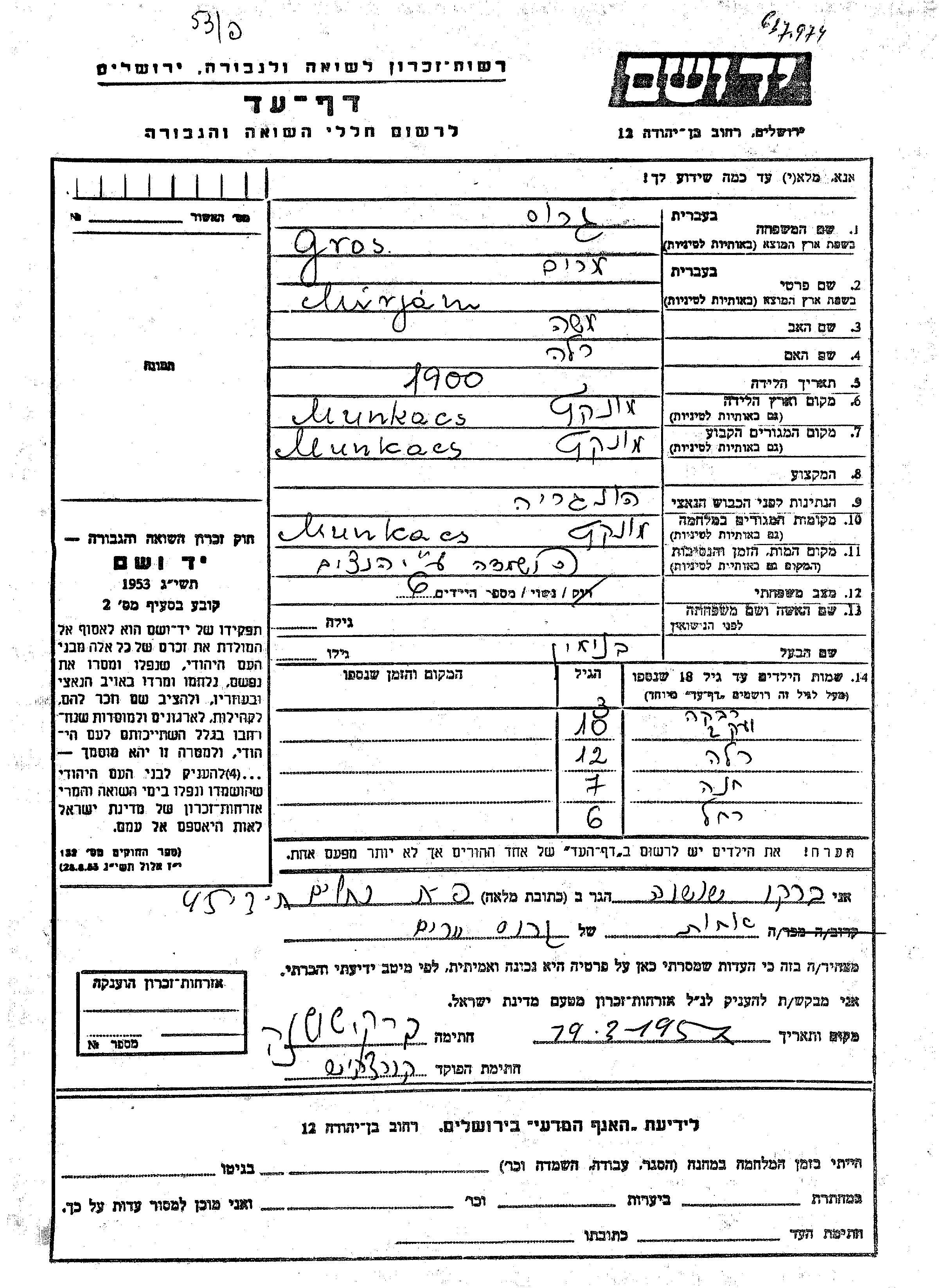 Gros Rivka Munkacs, Checoslovaquia Hoja de Testimonio
