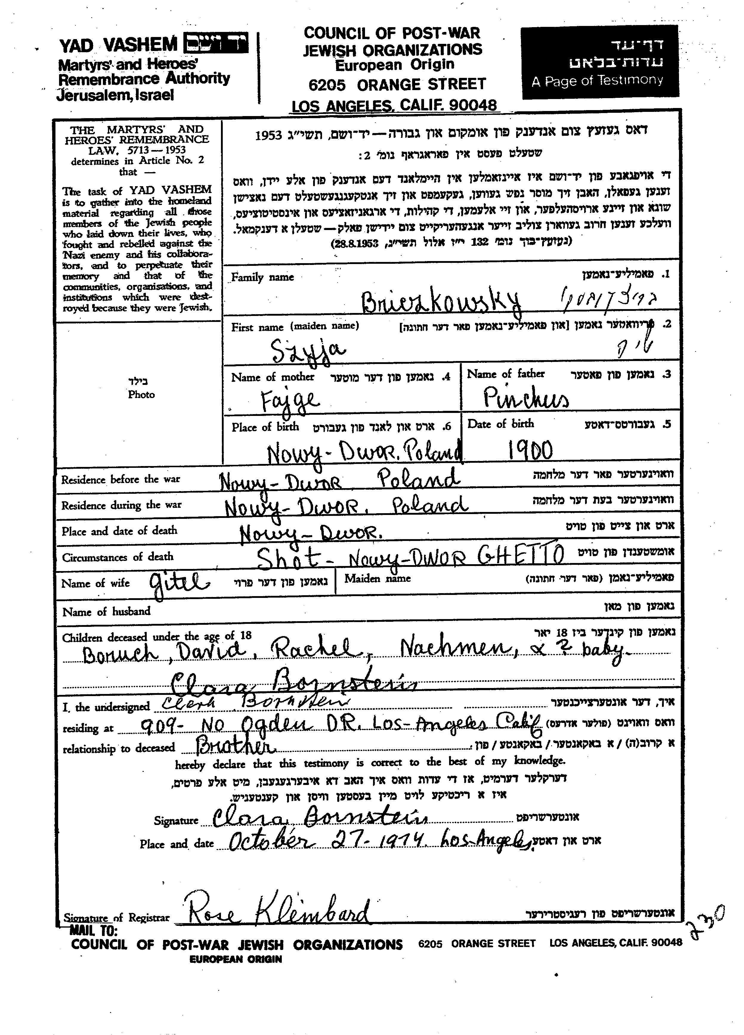Briczkowsky Boruch Novy Dvor, Polonia Hoja de Testimonio