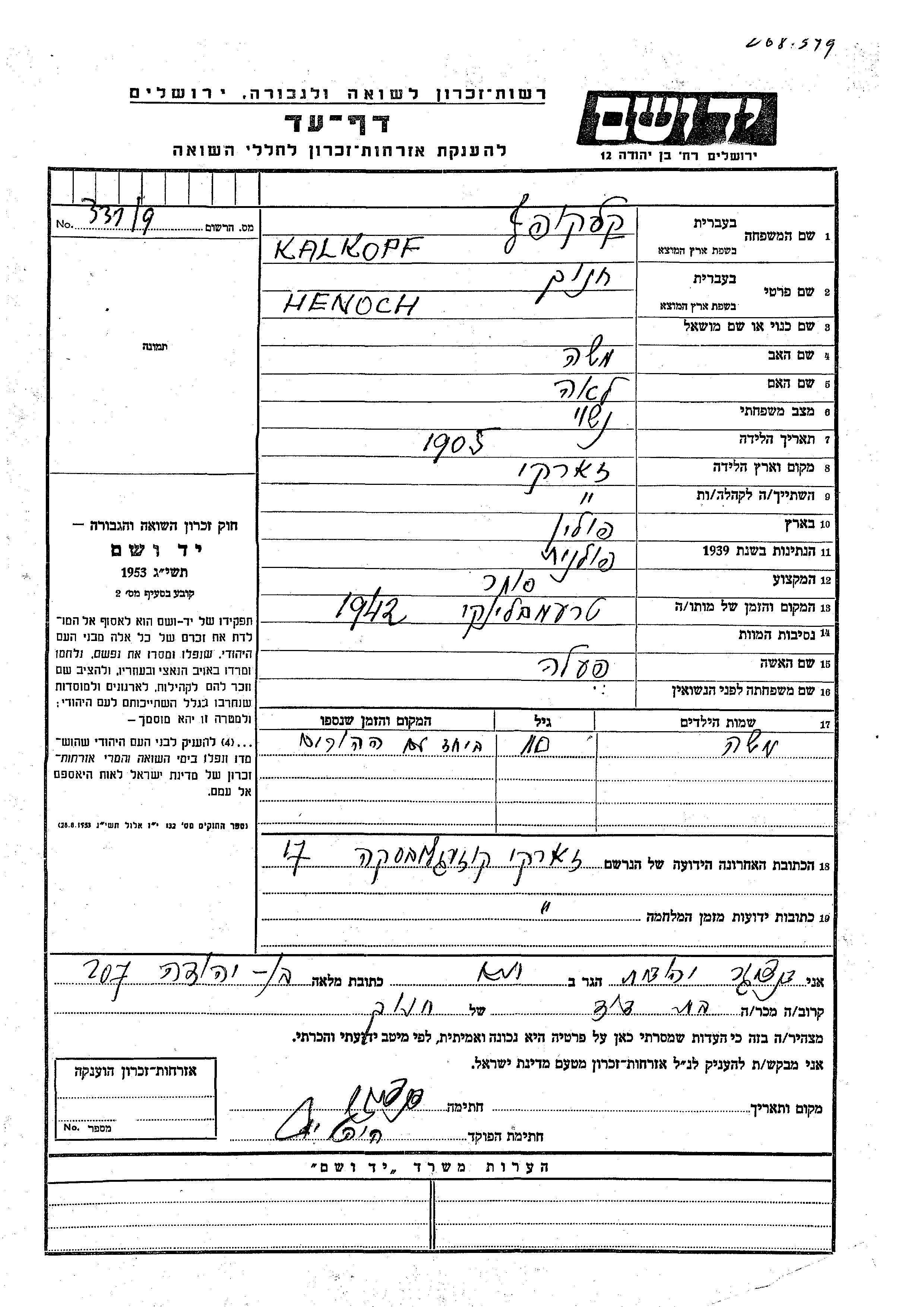 Kalkopf Moshe Zarki, Polonia Hoja de Testimonio