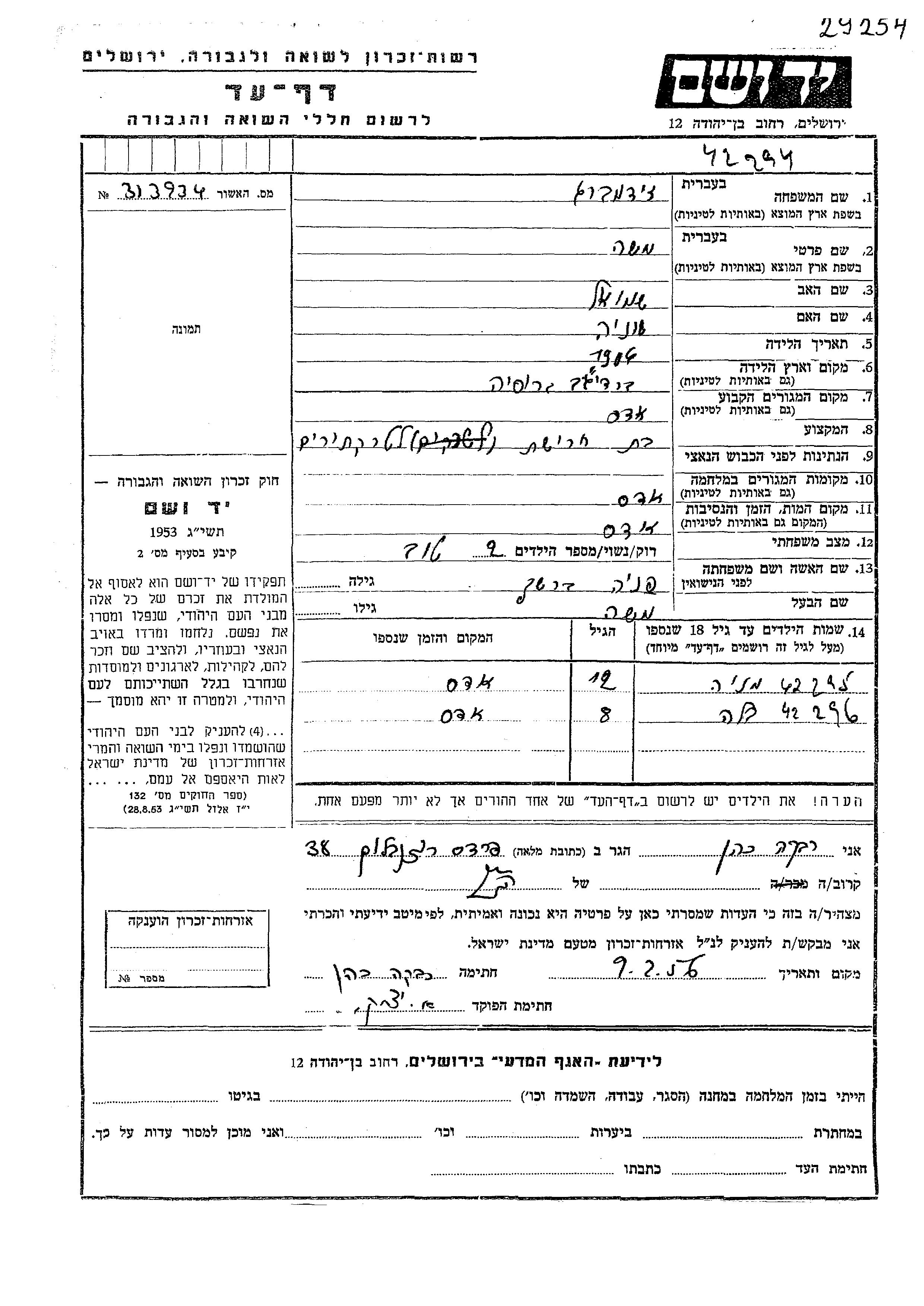 Yad Vashem - Colección conmemorativa de Hojas de Testimonio