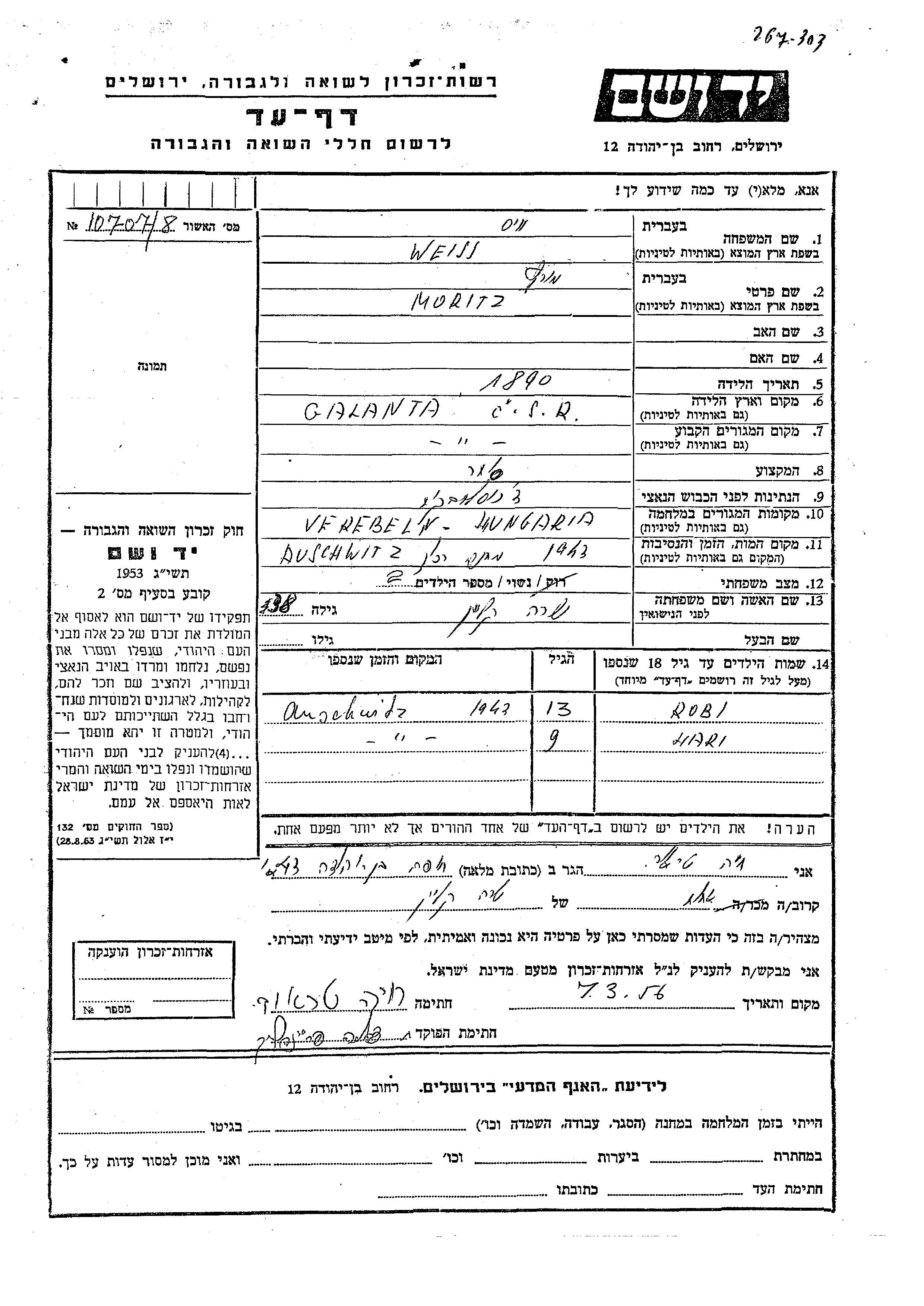 Weiss Hari Galanta, Checoslovaquia Hoja de Testimonio