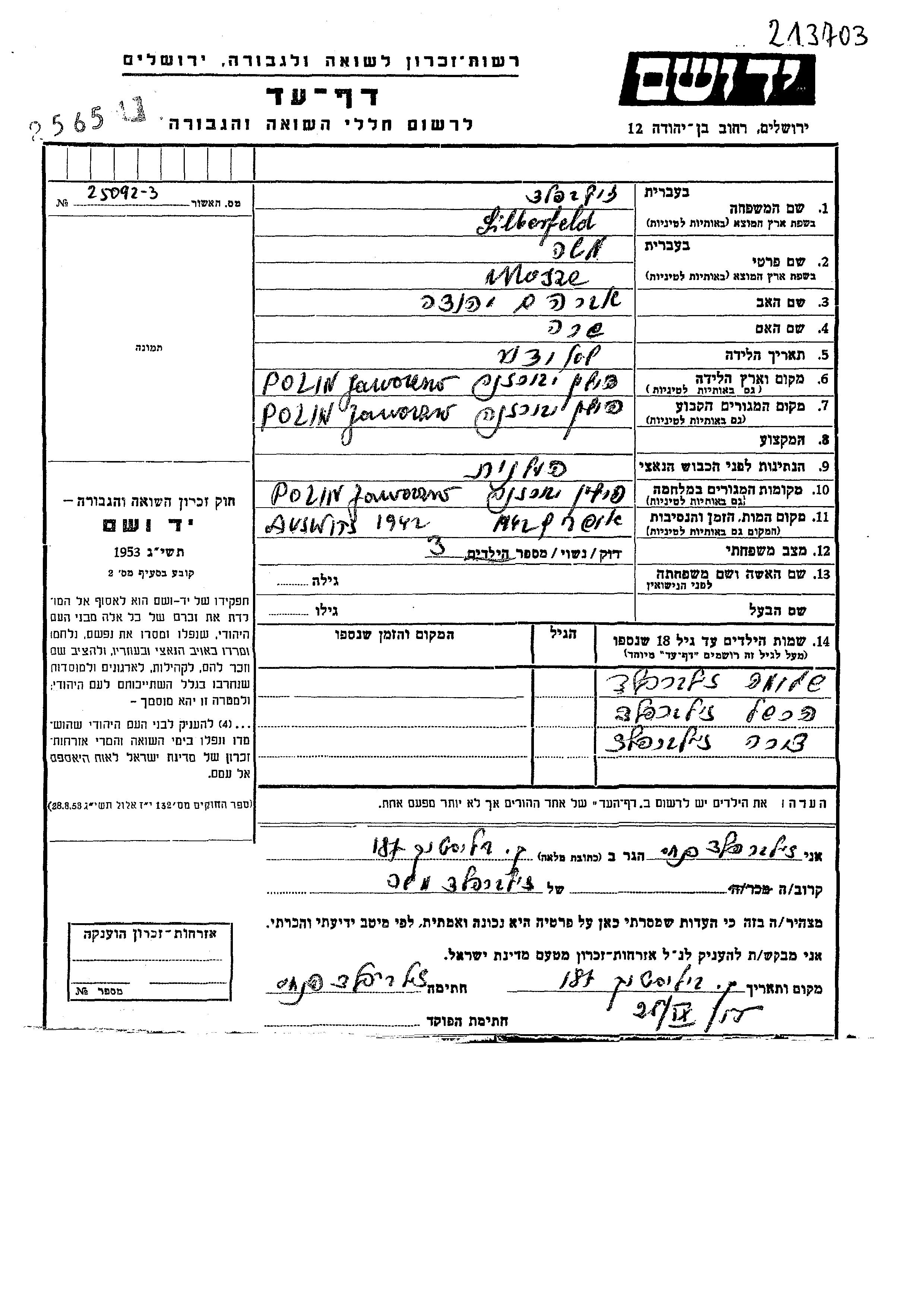 Silberfeld Tzira Jaworzno, Polonia Hoja de Testimonio