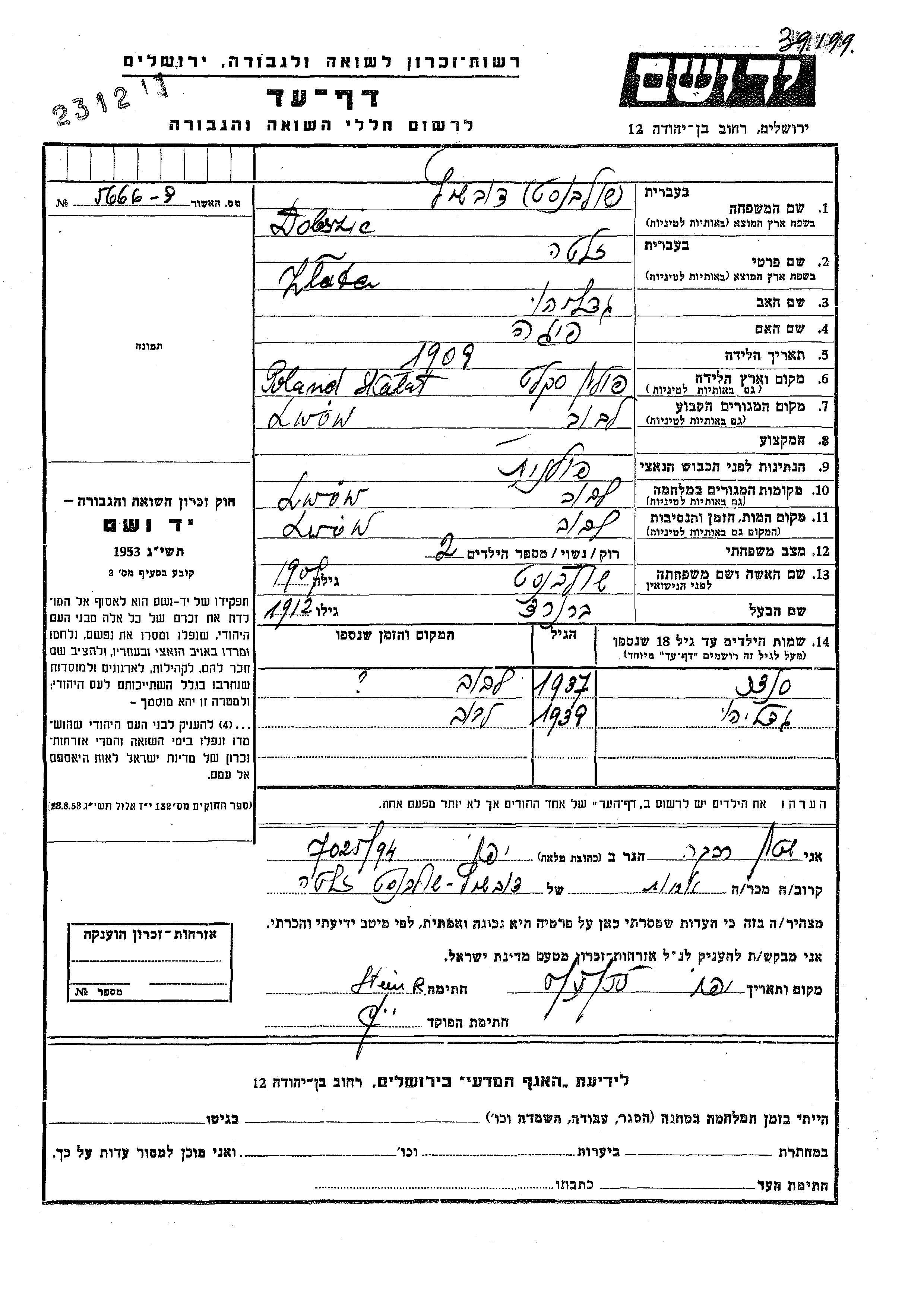 Dobszic Gdaliyahu 1939 Lwow, Polonia Hoja de Testimonio