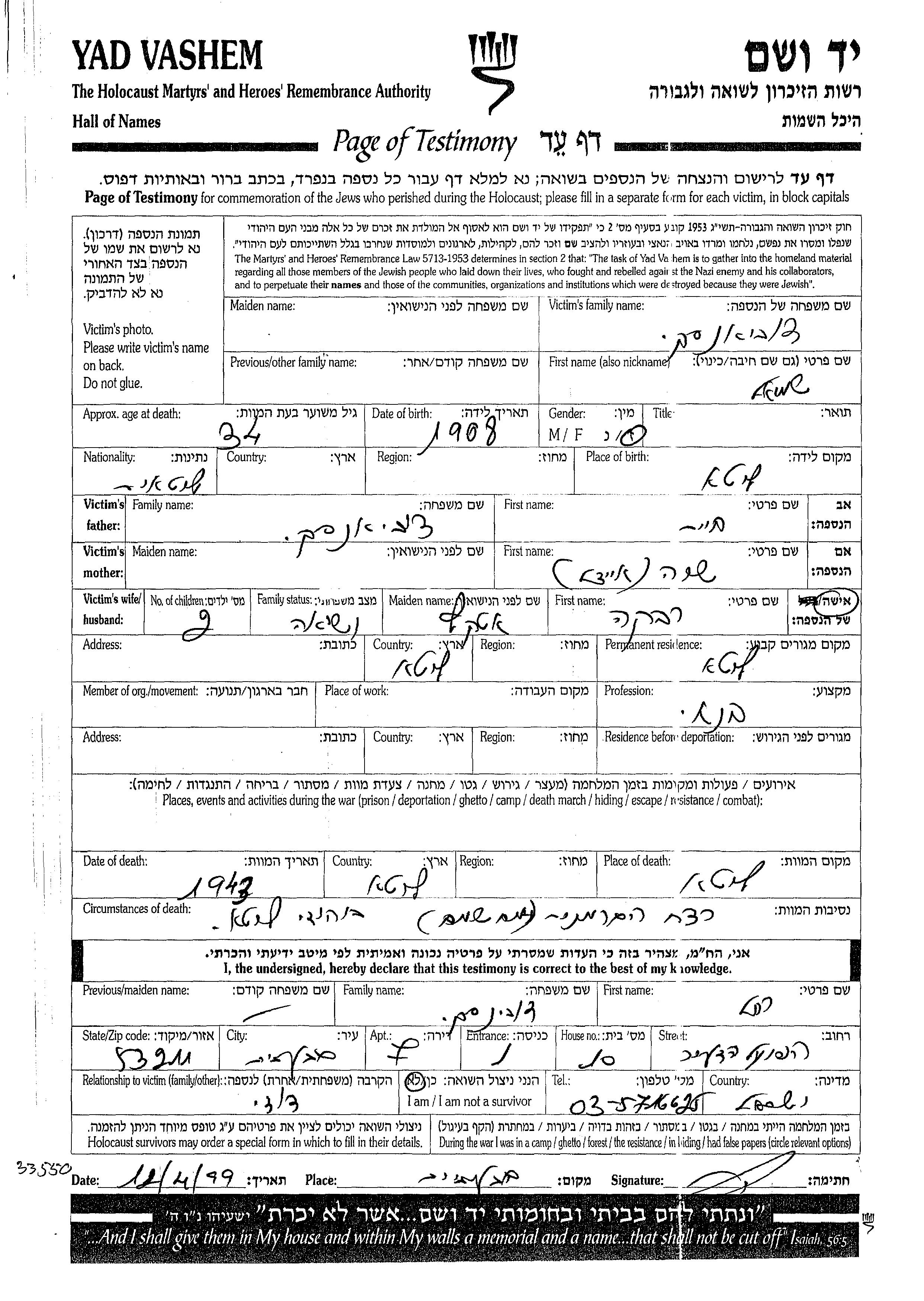 Yad Vashem - Colección conmemorativa de Hojas de Testimonio