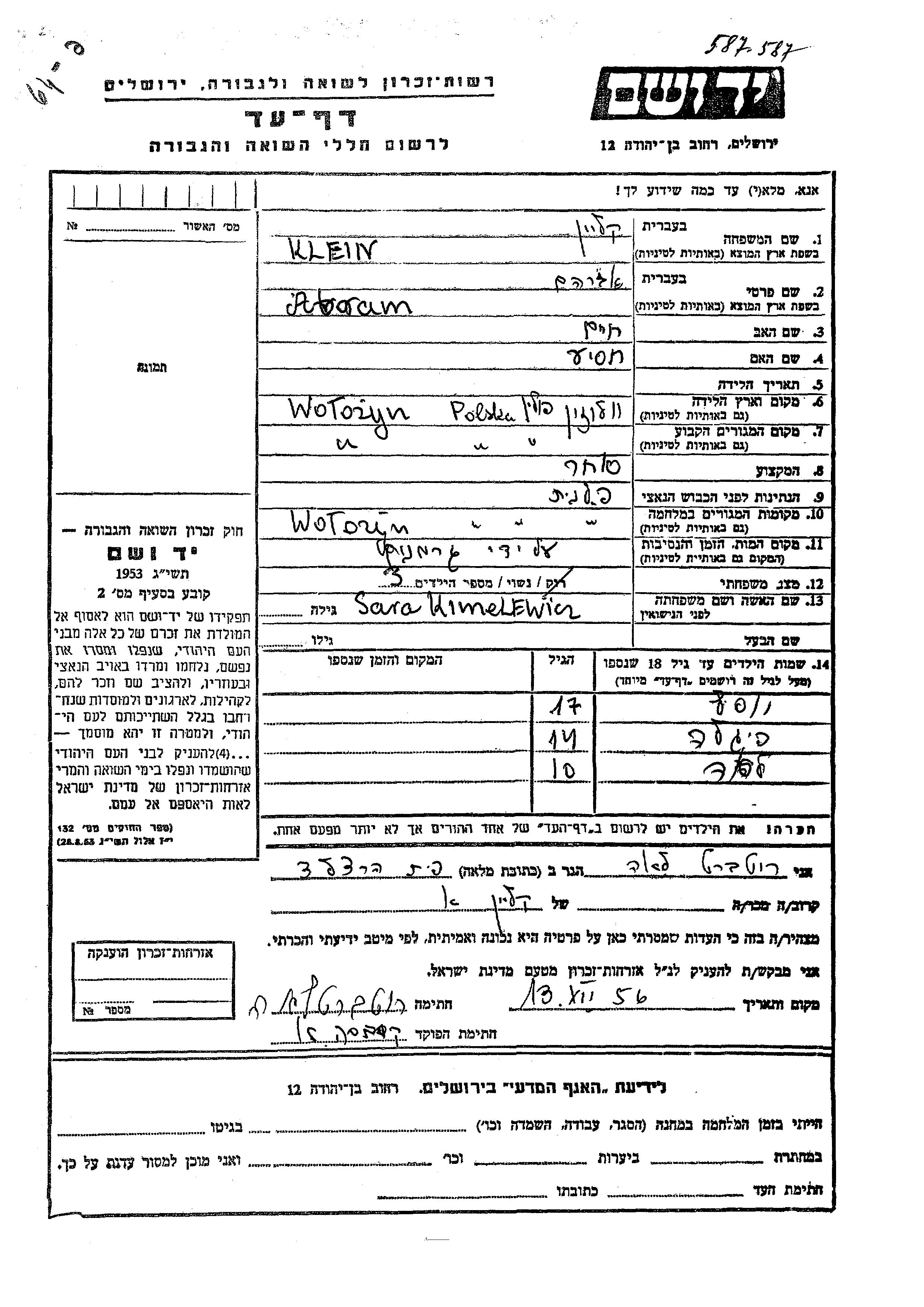 Klein Faigla Wolozyn, Polonia Hoja de Testimonio