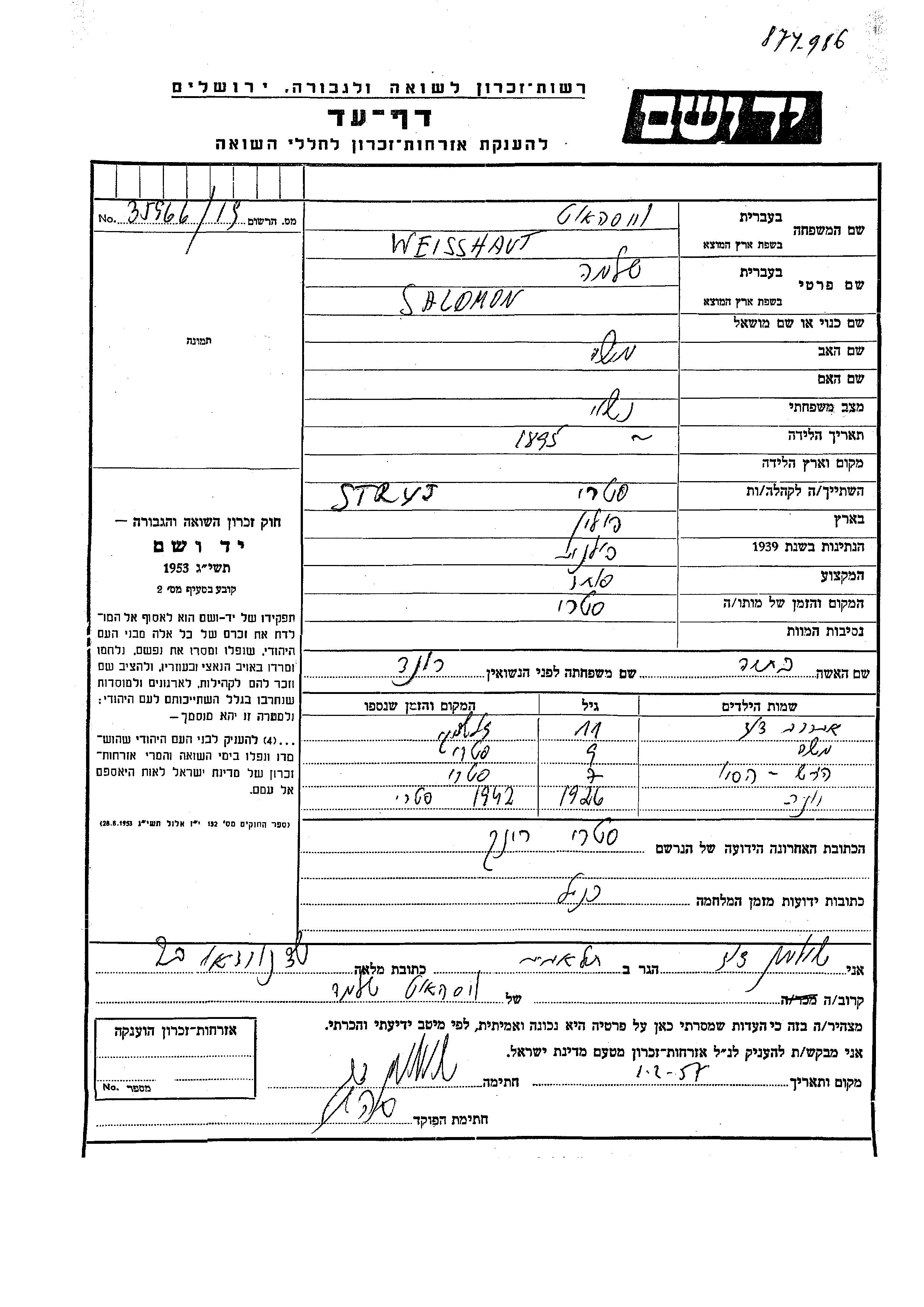 Weisshaut Yona 1926 Stryj, Polonia Hoja de Testimonio