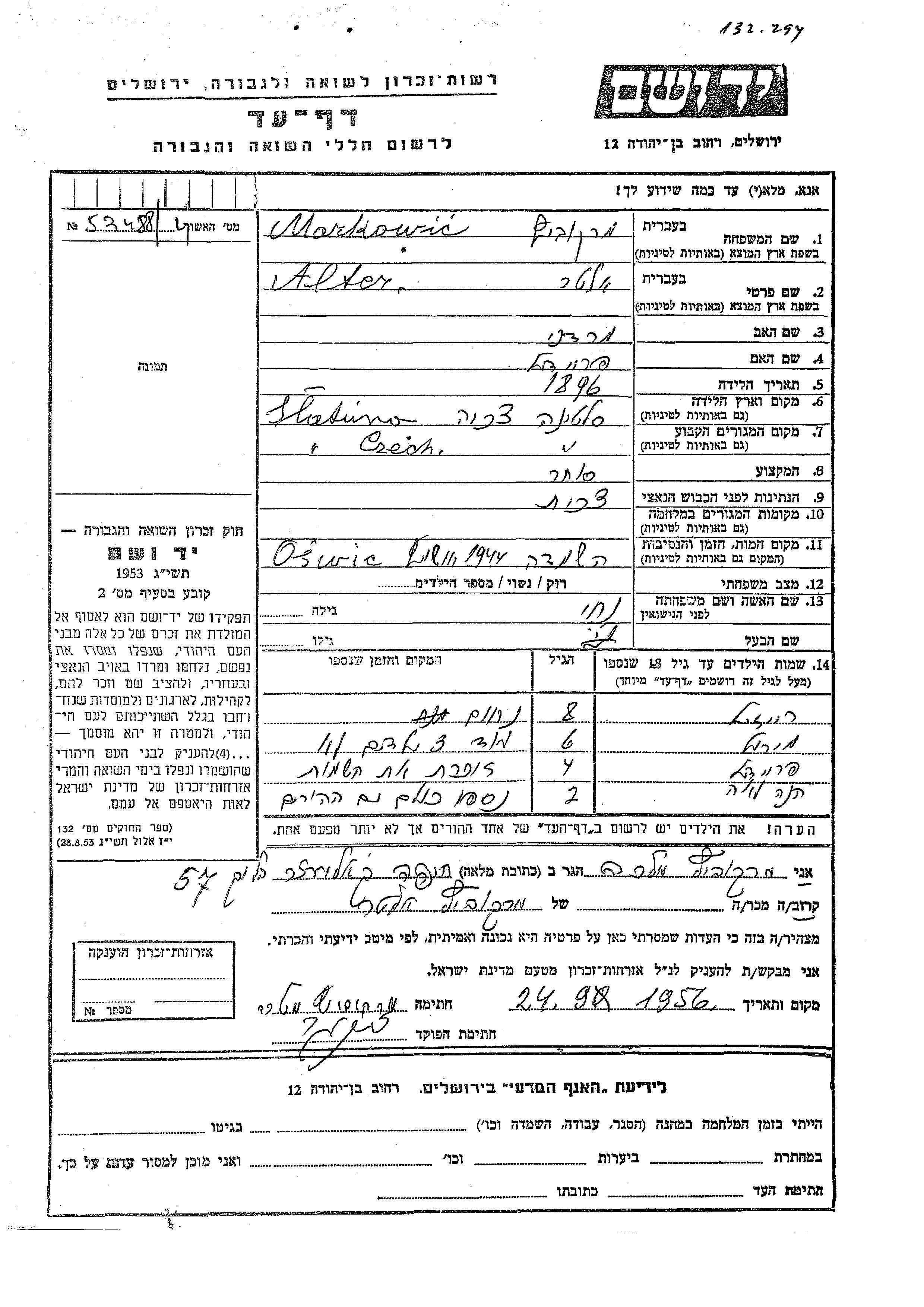 Markowic Freidel Slatina, Checoslovaquia Hoja de Testimonio