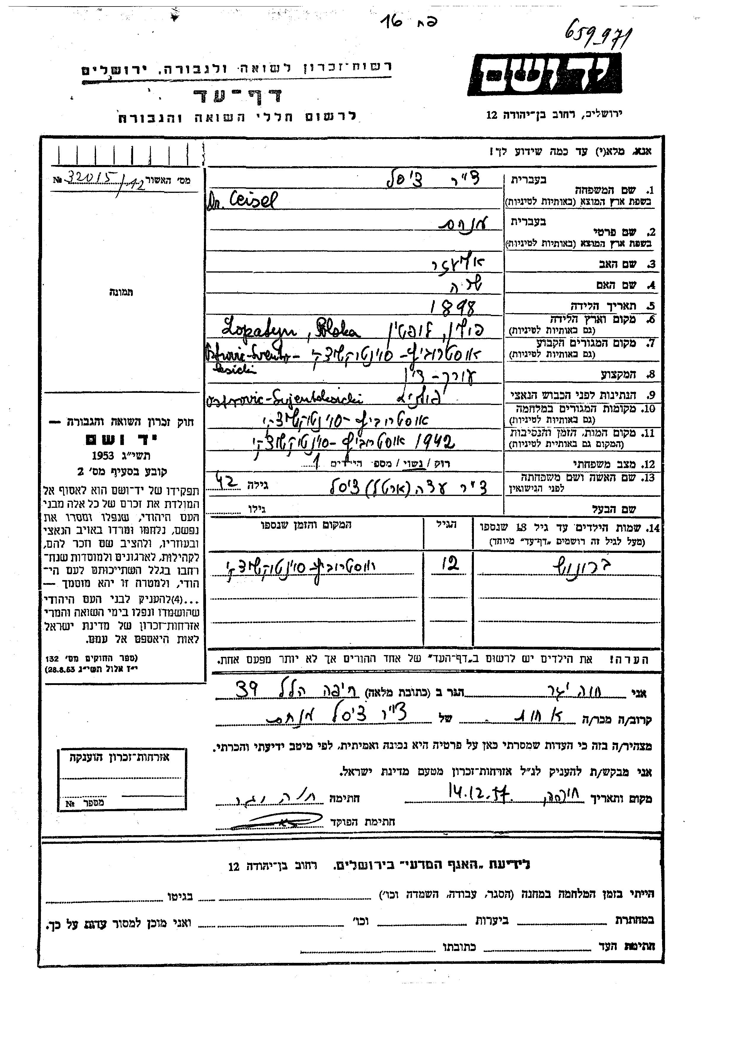Ceisel Bruno Ostrovitza, Polonia Hoja de Testimonio