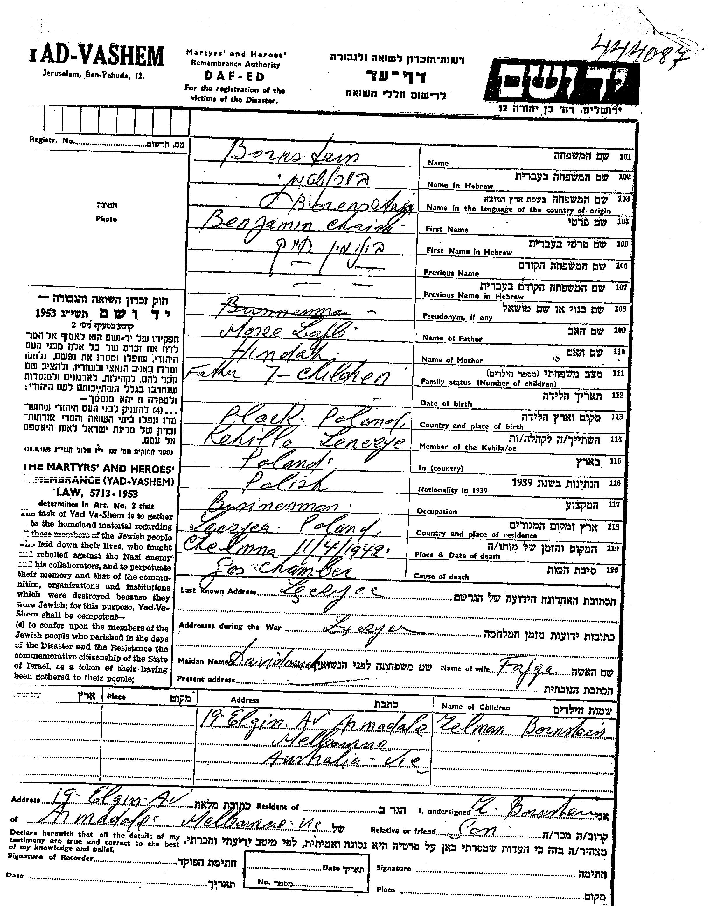 Zelman Bornstein nació Benjamin Chaim y Fajga apellido de soltera Davidovich. Era Niñoa. Antes de la segunda guerra mundial vivía en Leczyca, Polonia. Durante la guerra estuvo en Leczyca, Polonia.