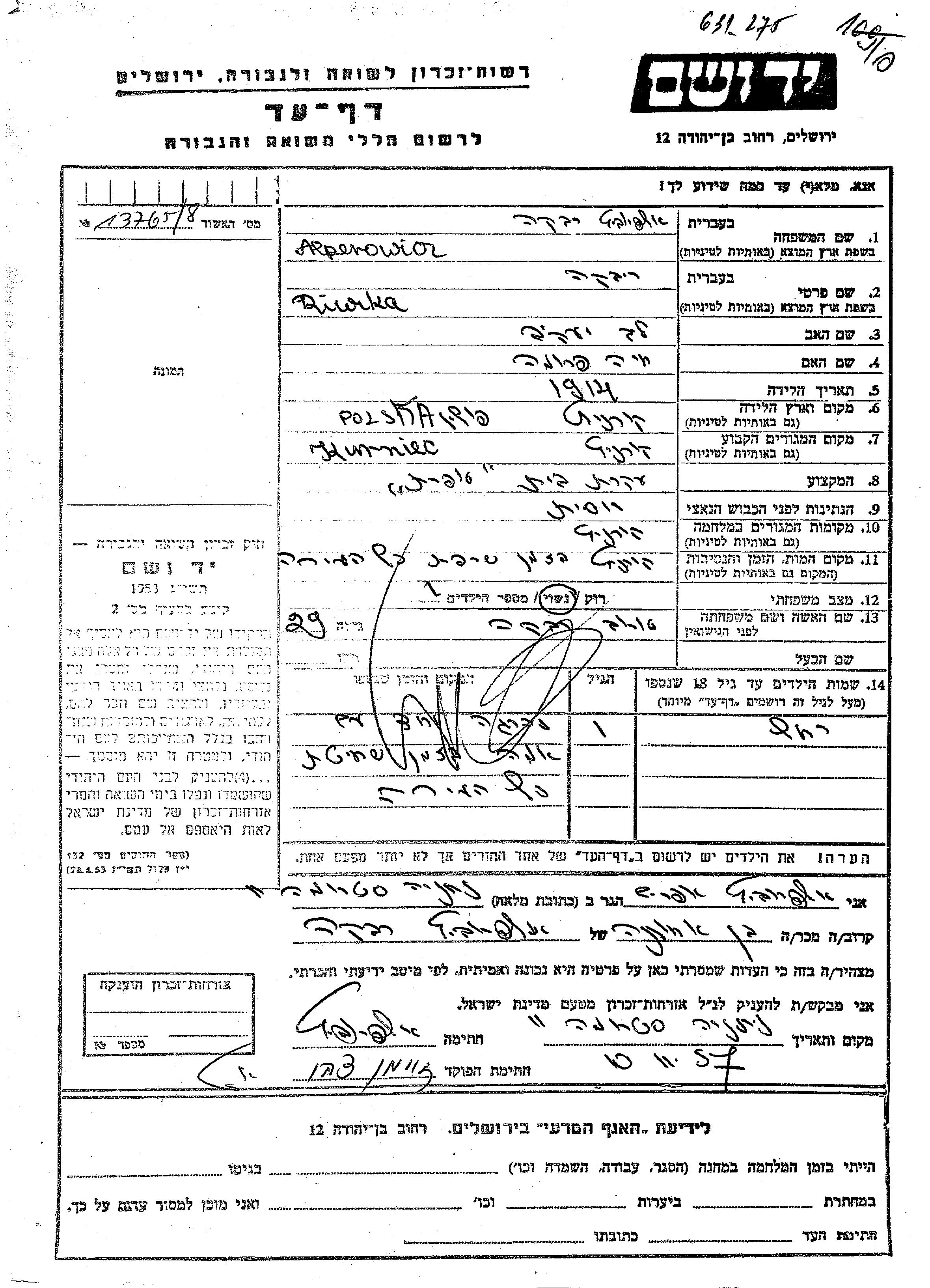 Alperowicz Rakhel Kurnica, Polonia Hoja de Testimonio