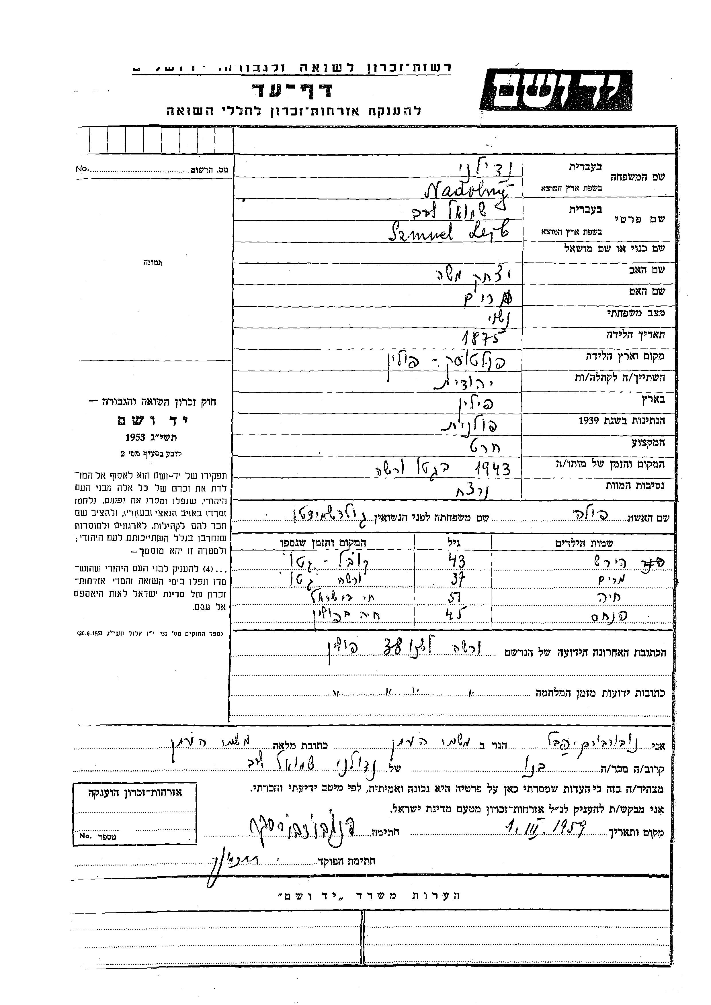 Nadolny Hirsh Warsaw, Polonia Hoja de Testimonio