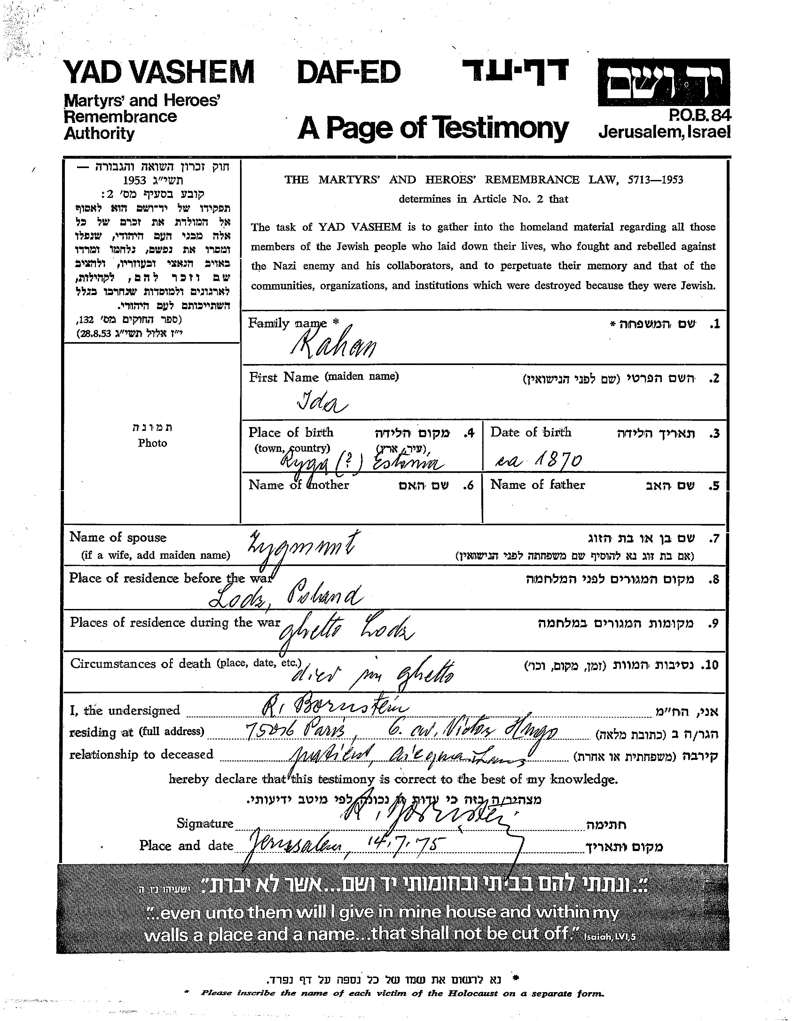 Kahan Ida 1870 Lodz, Polonia Hoja de Testimonio