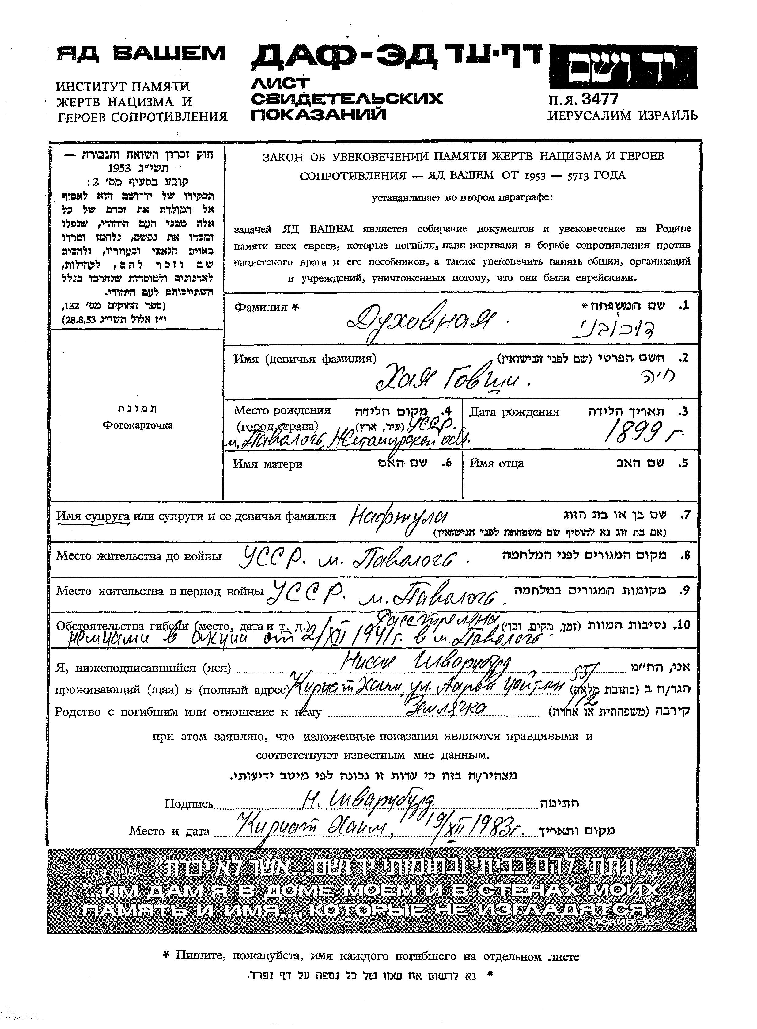 Khaia Dukhovnaya apellido de soltera Govshi nació en Pavoloch, Ucrania (URSS) en 1899. Era casada con Naftula. Antes de la segunda guerra mundial vivía en Pavoloch, Ucrania (URSS). Durante la guerra estuvo en Pavoloch, Ucrania (URSS).