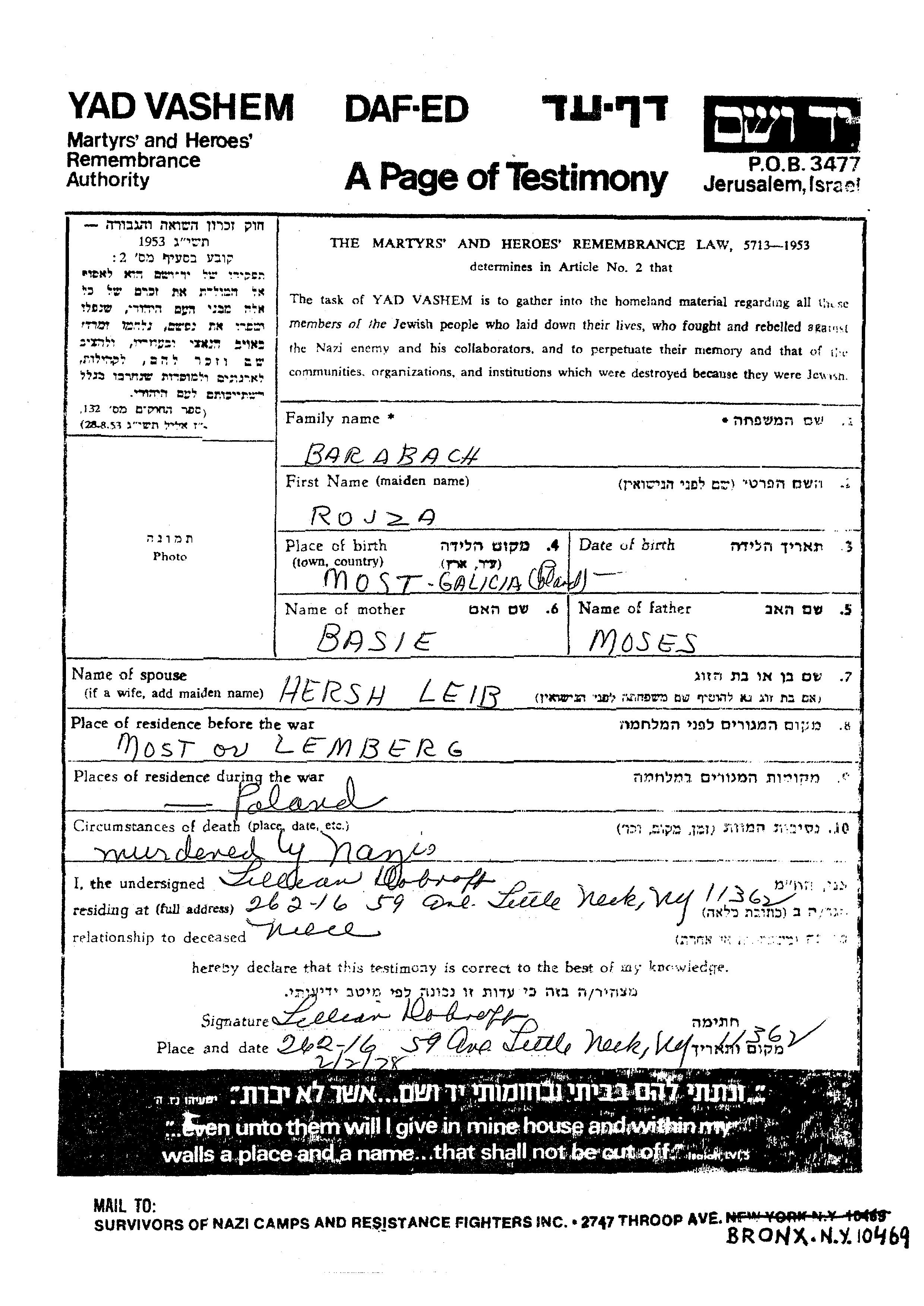Barabach Rojza Mosty Wielkie, Polonia Hoja de Testimonio