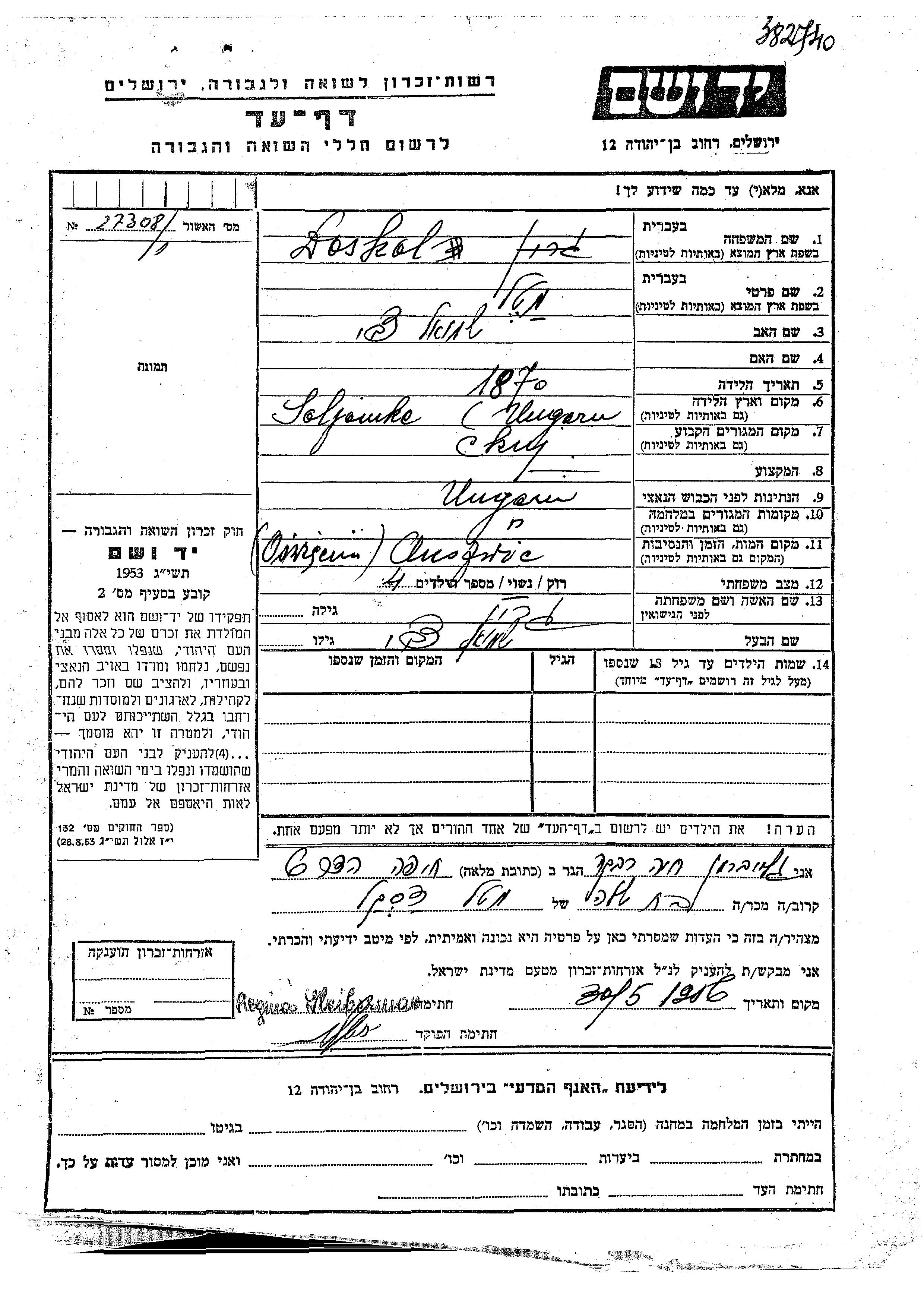 Yad Vashem - Colección conmemorativa de Hojas de Testimonio