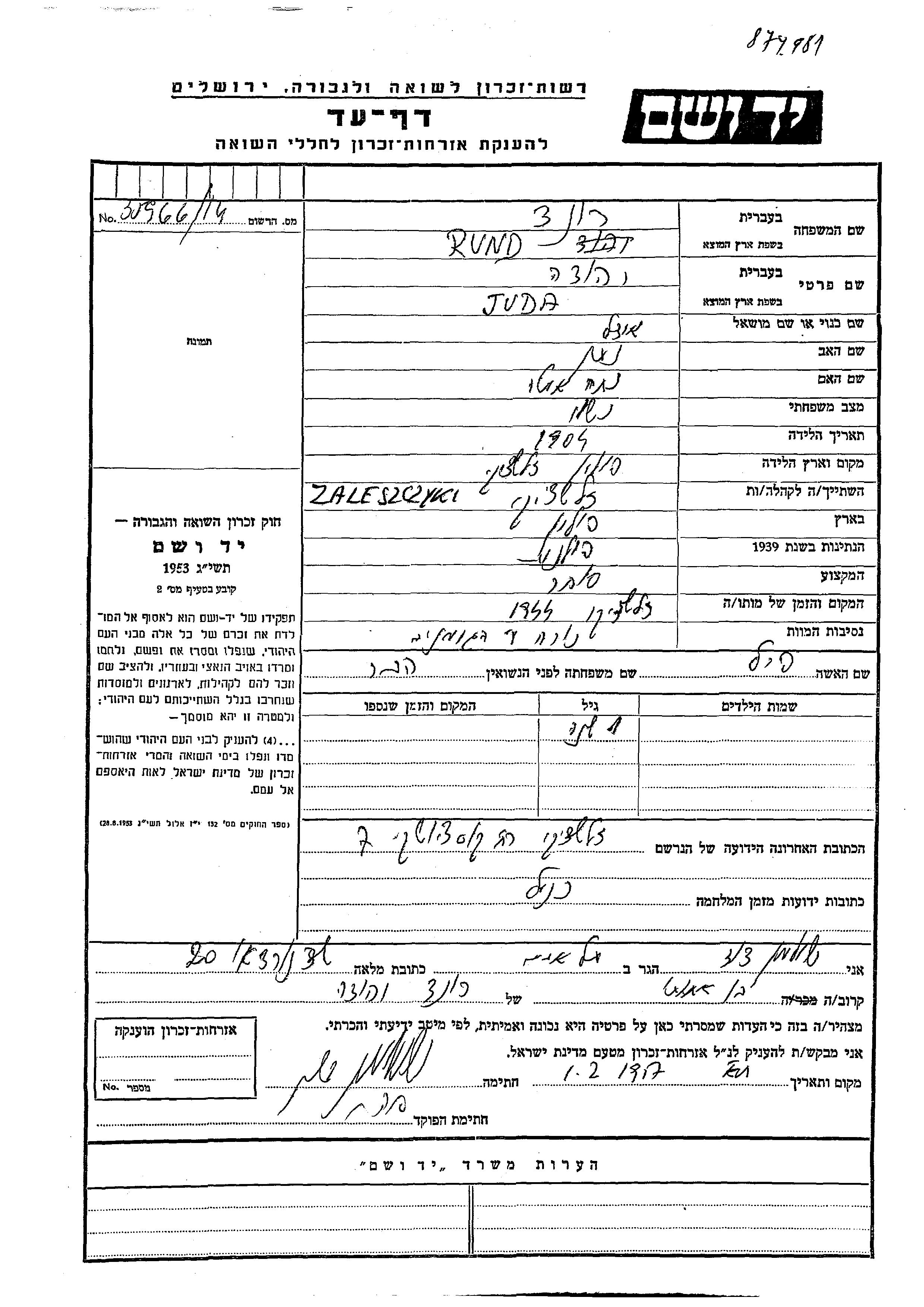 Rund nombre desconocido Zaleszcyki, Polonia Hoja de Testimonio