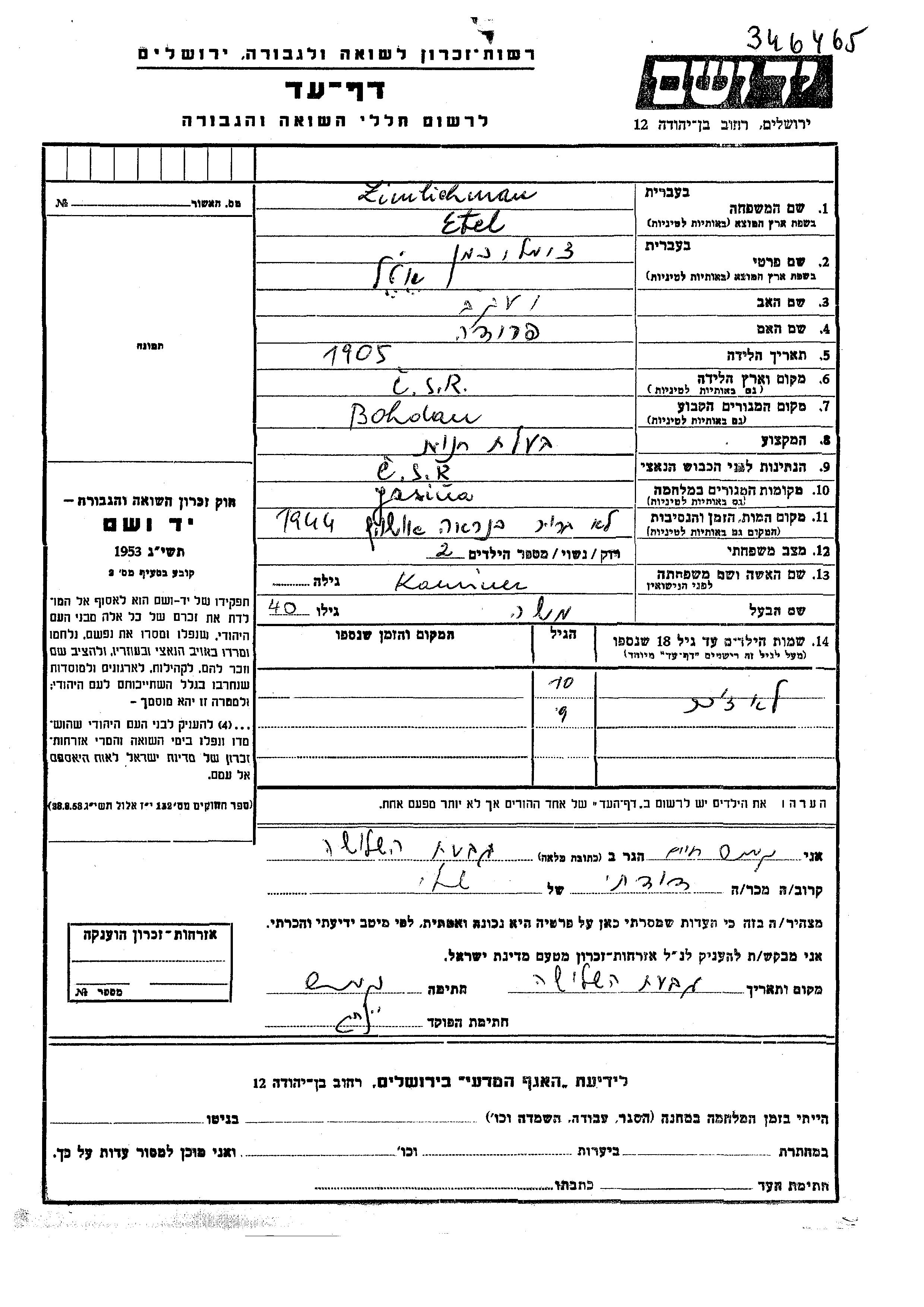 Zimlichman Etel 1905 Bohdan, Checoslovaquia Hoja de Testimonio