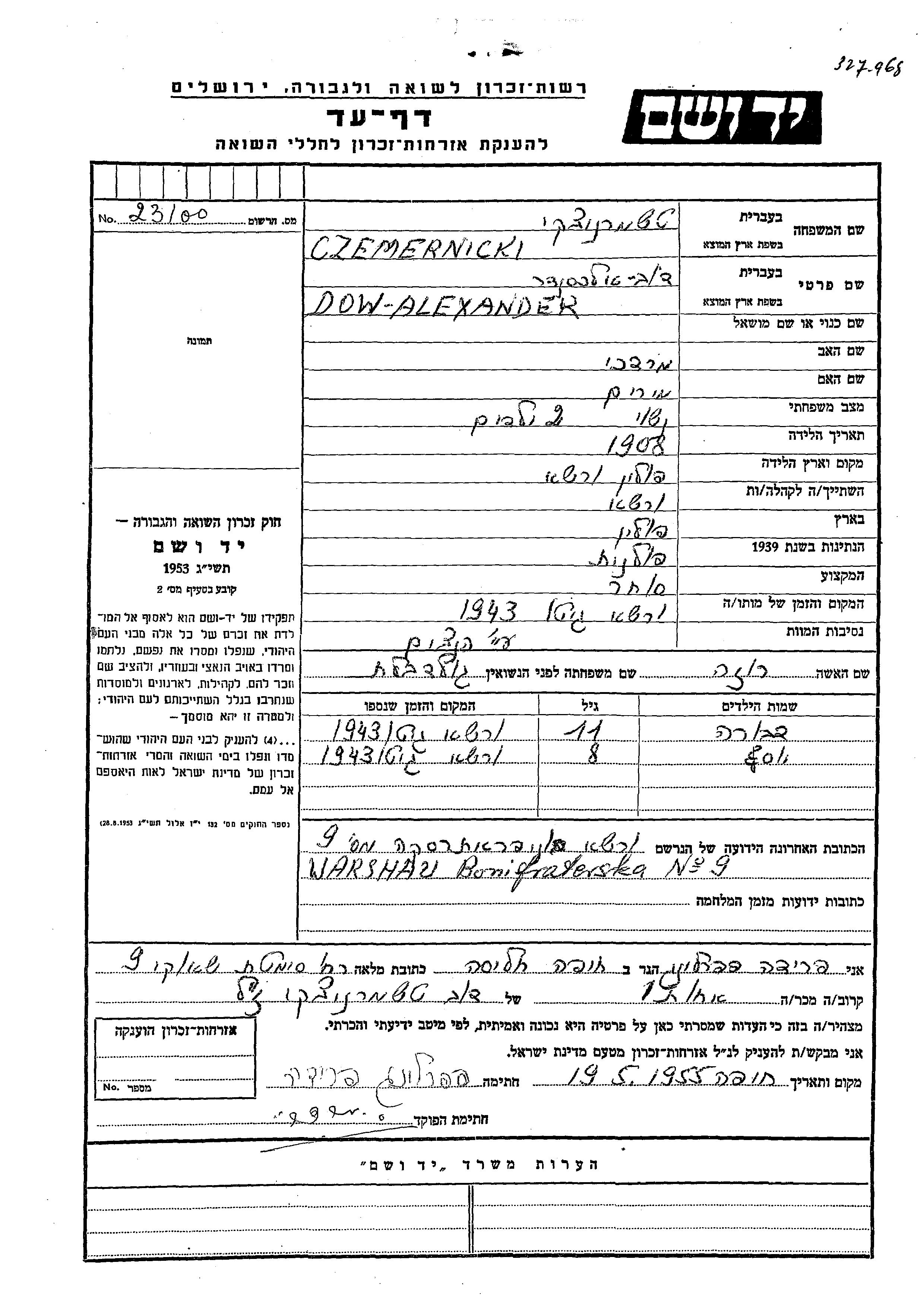 Dow Alexander Czemernicki nació en Warszawa, Polonia en 1908, hijo de Mordekhai y Miriam. Era Comereciante y Casado con Roza apellido de soltera Goldblat. Antes de la segunda guerra mundial vivía en Warszawa, Polonia. Durante la guerra estuvo en Warszawa, Polonia.
