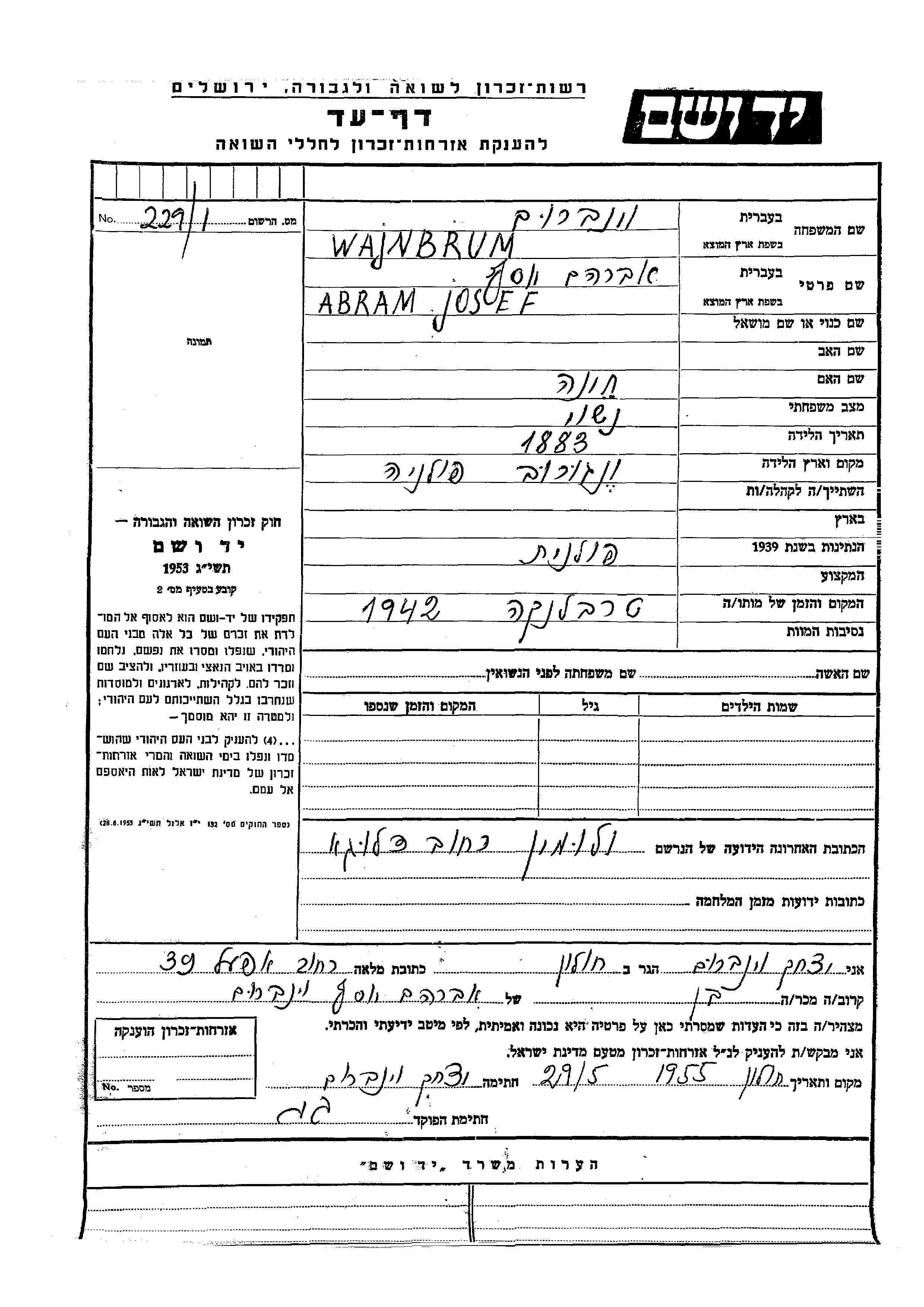 Wajnbrum Abram Josef 1883 lugar desconocido, Hoja de Testimonio
