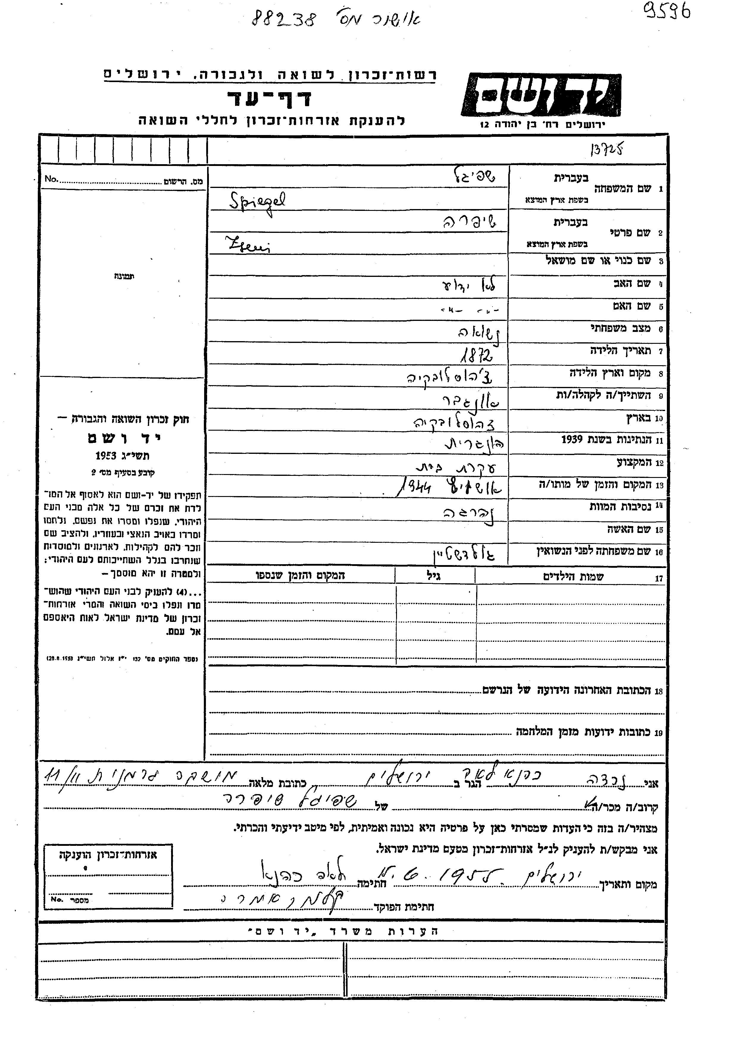 Spiegel Zseni Shifra 1872 Uzhorod, Checoslovaquia Hoja de Testimonio