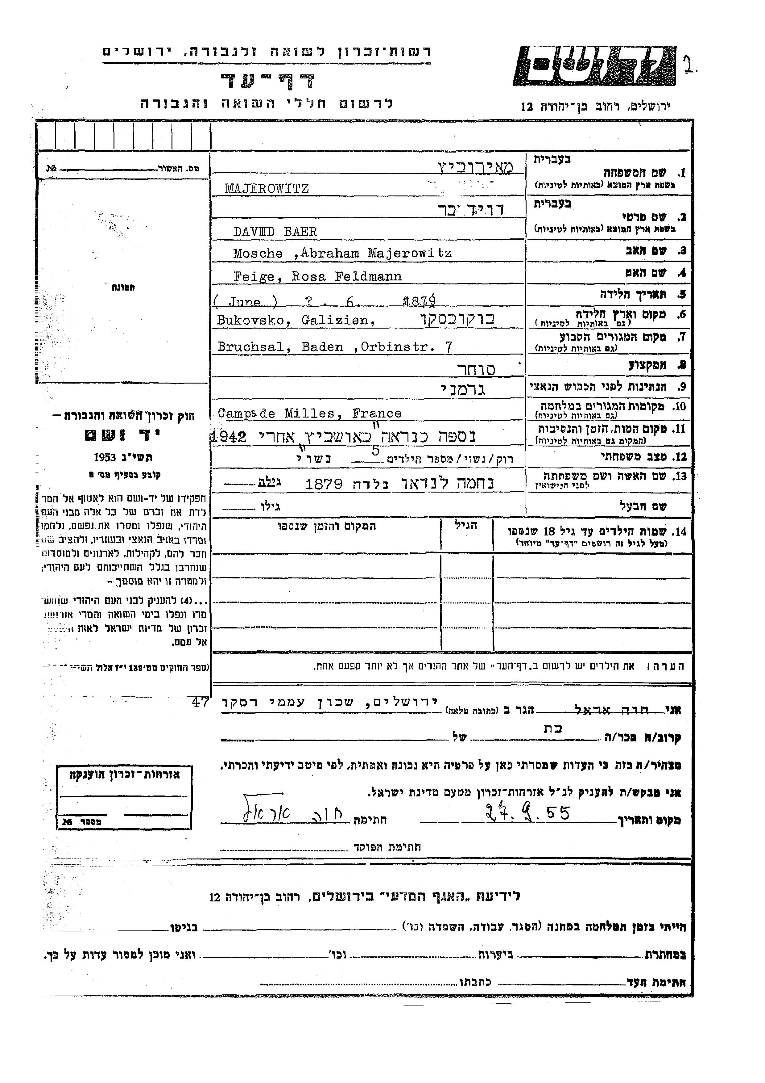 Baer David Majerowitz nació en Bukowsko, Polonia en 1879, hijo de Mosche Abraham y Feiga Rosa apellido de soltera Feldmann. Era Comereciante y Casado con Nekhama apellido de soltera Landau. Antes de la segunda guerra mundial vivía en Bruchsal, Alemania. Durante la guerra estuvo en Camp des Milles, Francia.