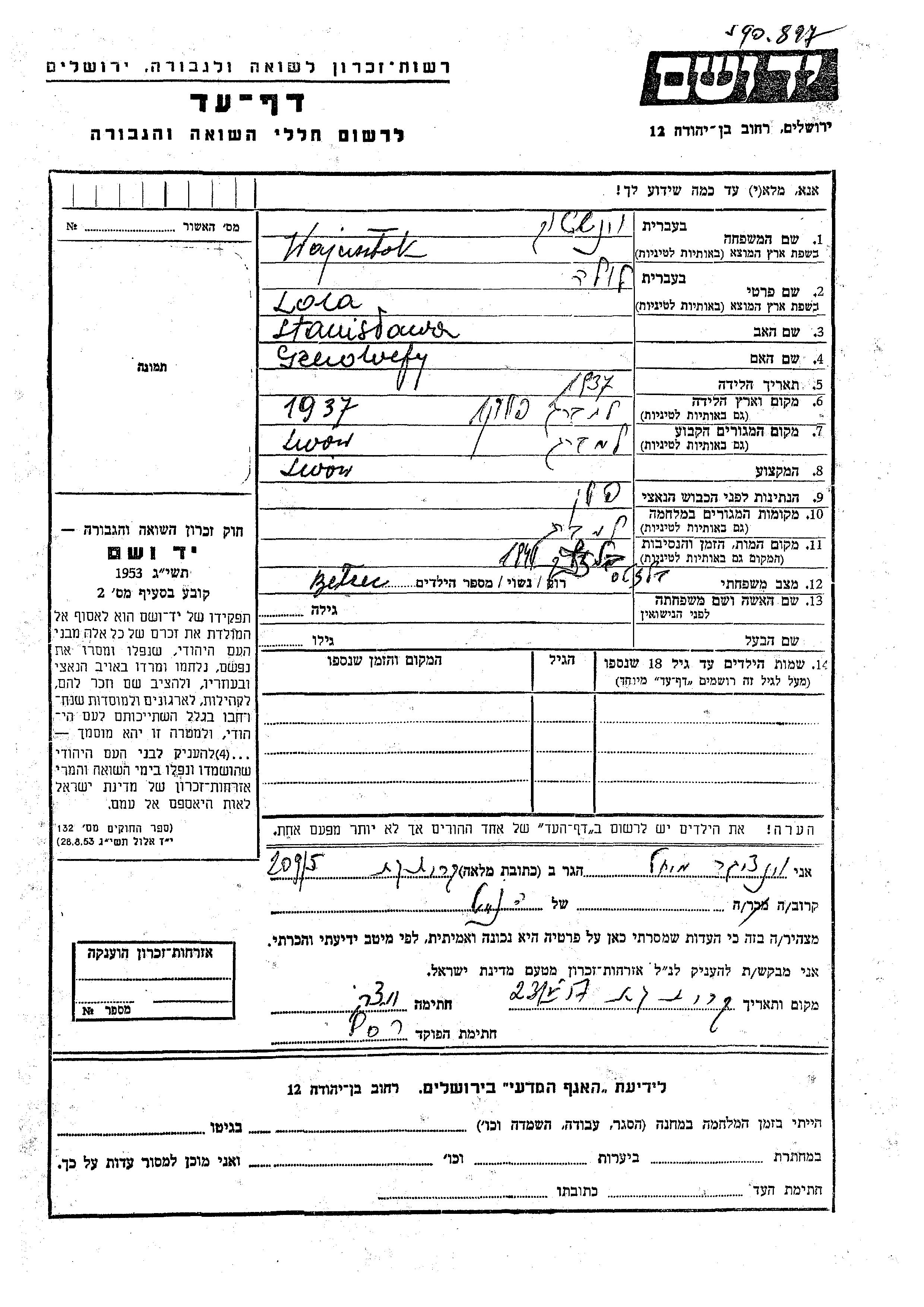 Wajstok Vinshtok Lola 1937 Lwow, Polonia Hoja de Testimonio