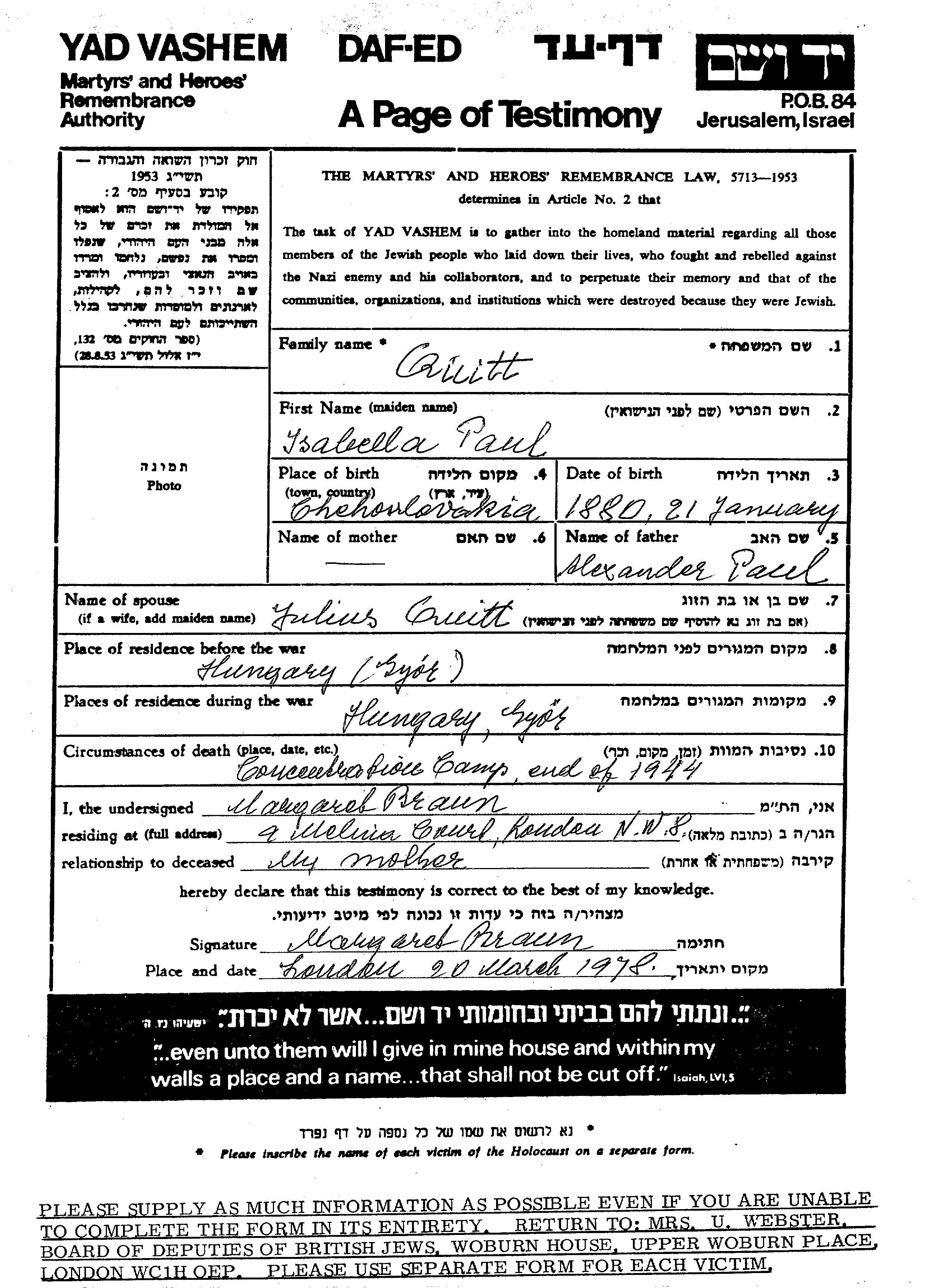 Isabella Czilit apellido de soltera Paul nació en Checoslovaquia en 1880, hija de Alexander. Era casada con Yulius. Antes de la segunda guerra mundial vivía en Gyor, Hungría. Durante la guerra estuvo en Gyor, Hungría.