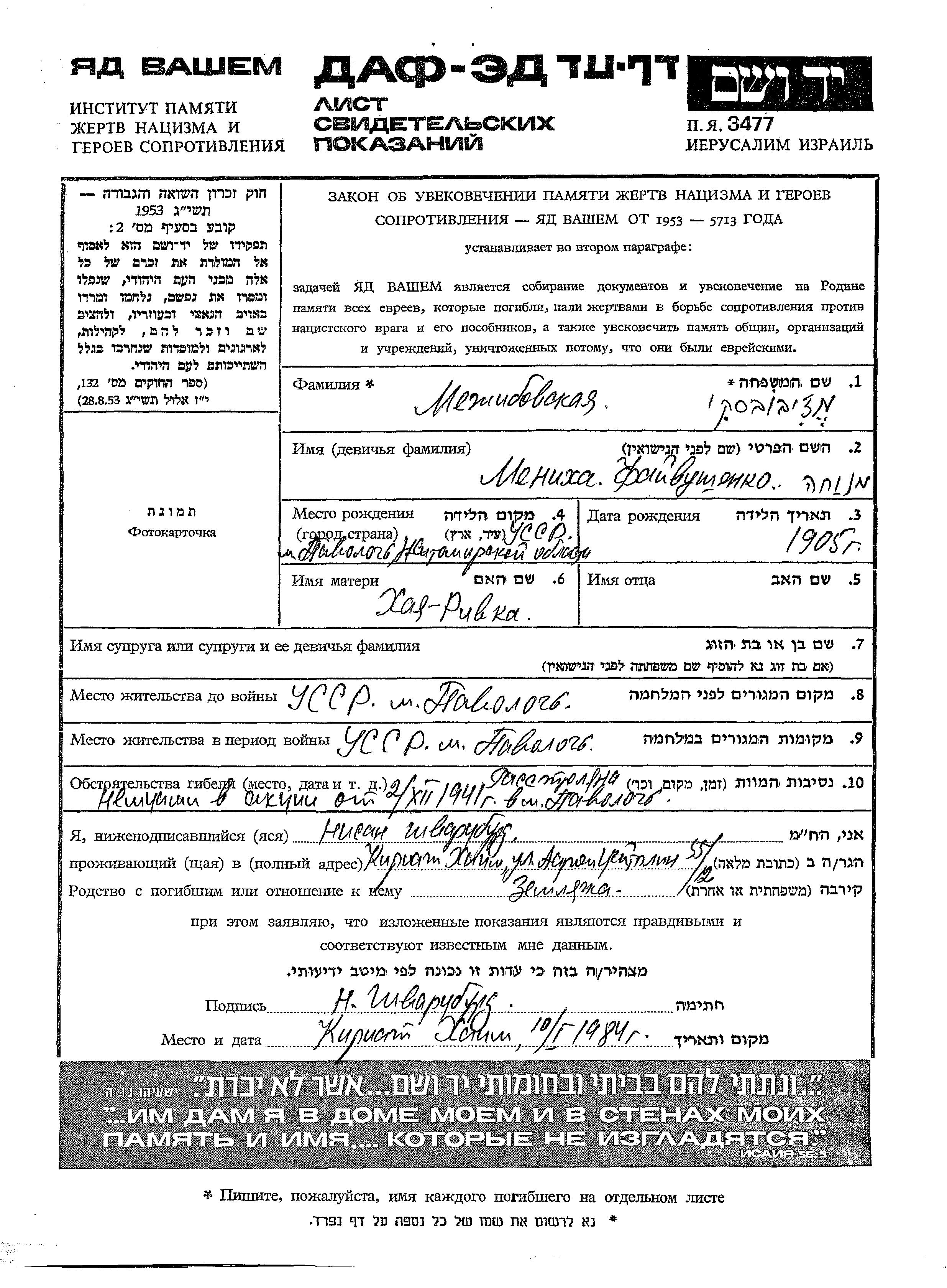 Mezhibovski Menukha 1905 Pavoloch, Ucrania (URSS) Hoja de Testimonio