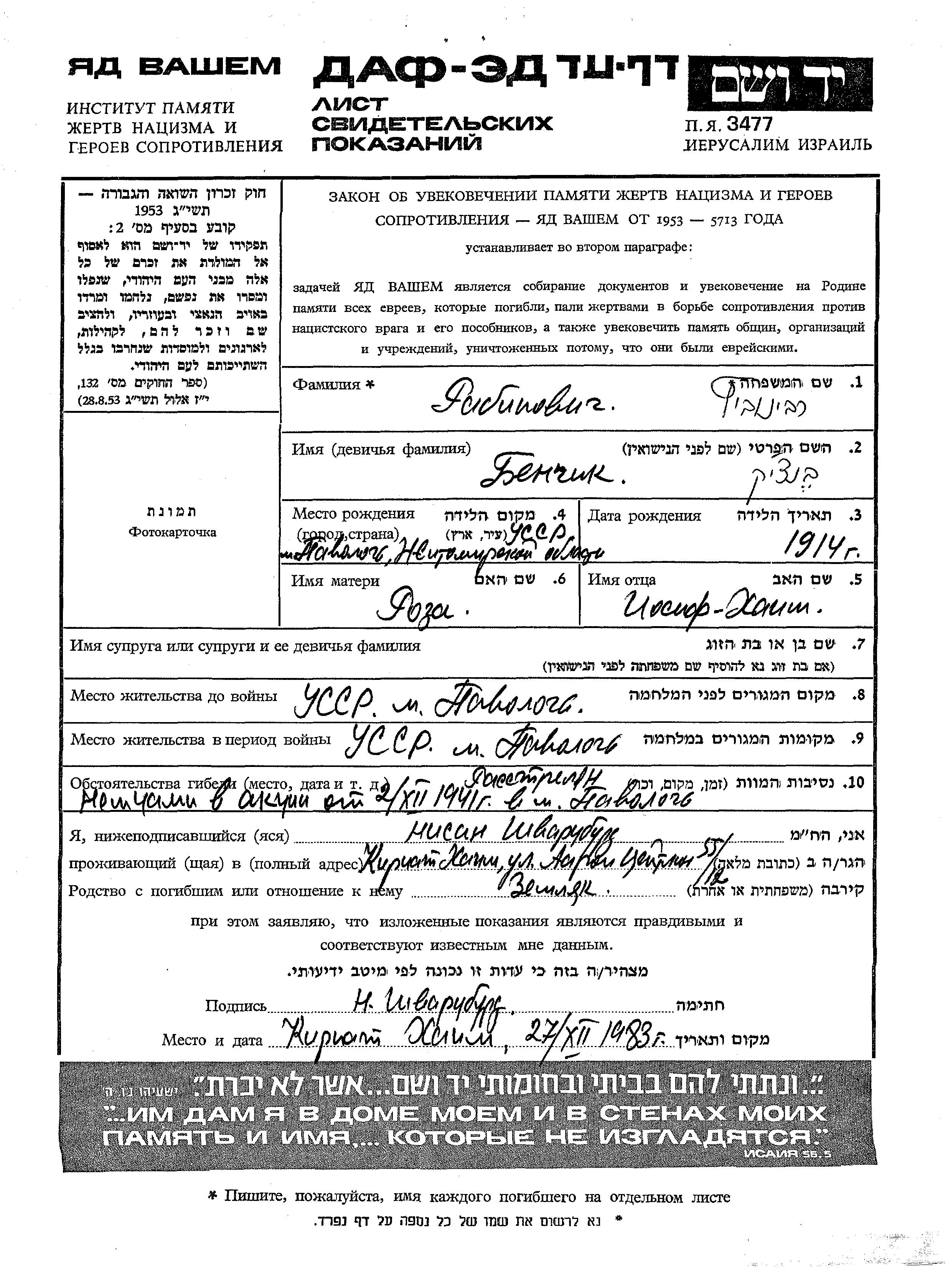 Rabinovich Benchik 1914 Pavoloch, Ucrania (URSS) Hoja de Testimonio