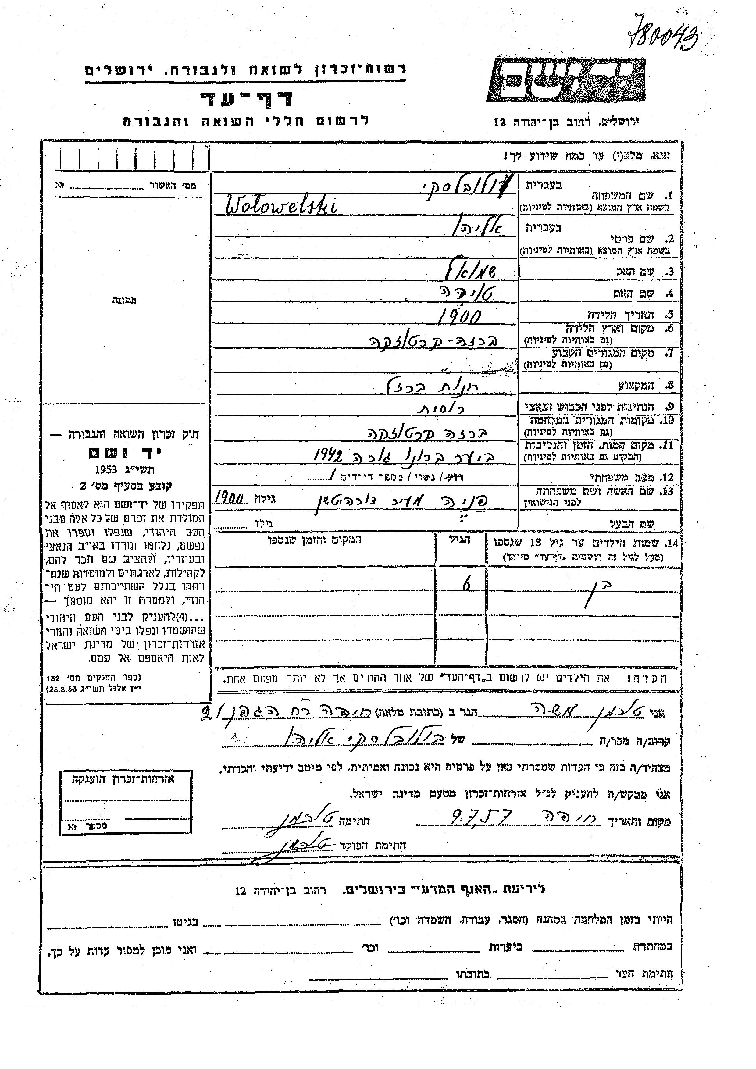 Wolowelski Eliahu 1900 Bereza Kartuska, Polonia Hoja de Testimonio