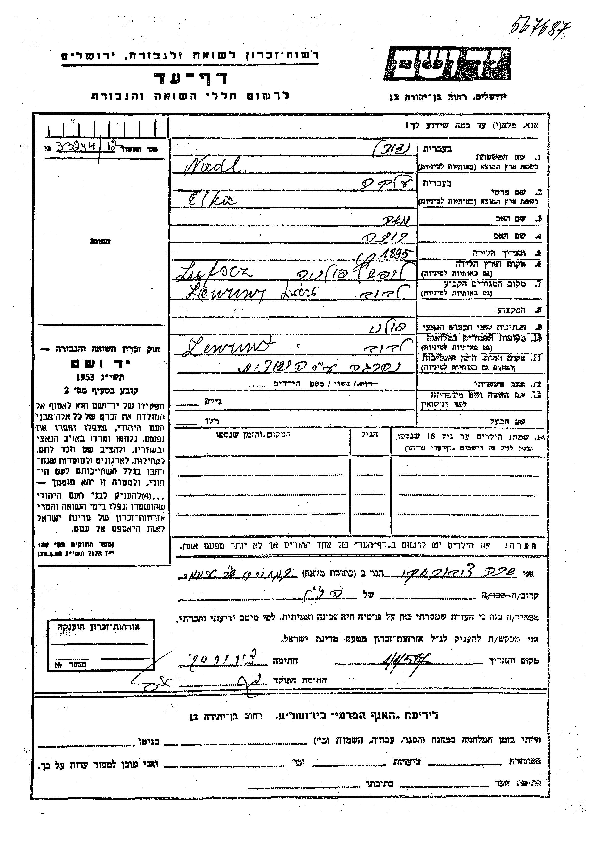 Nadl Elka 1895 Lwow, Polonia Hoja de Testimonio