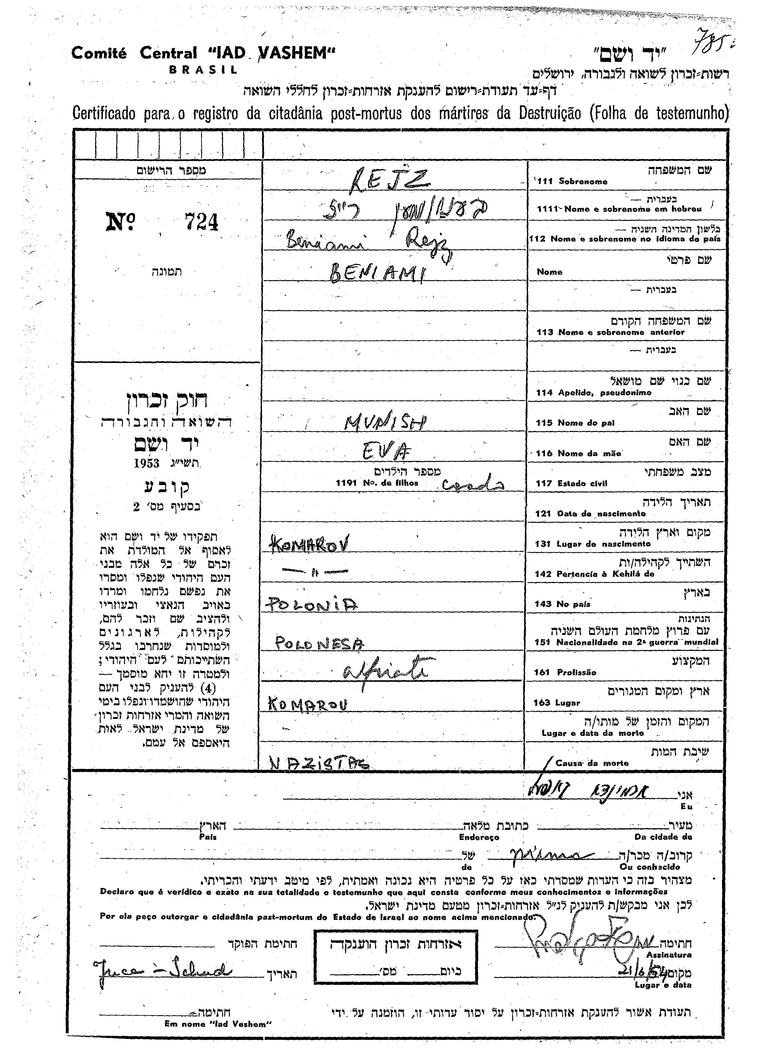 Rejz Beniami Komarow, Polonia Hoja de Testimonio