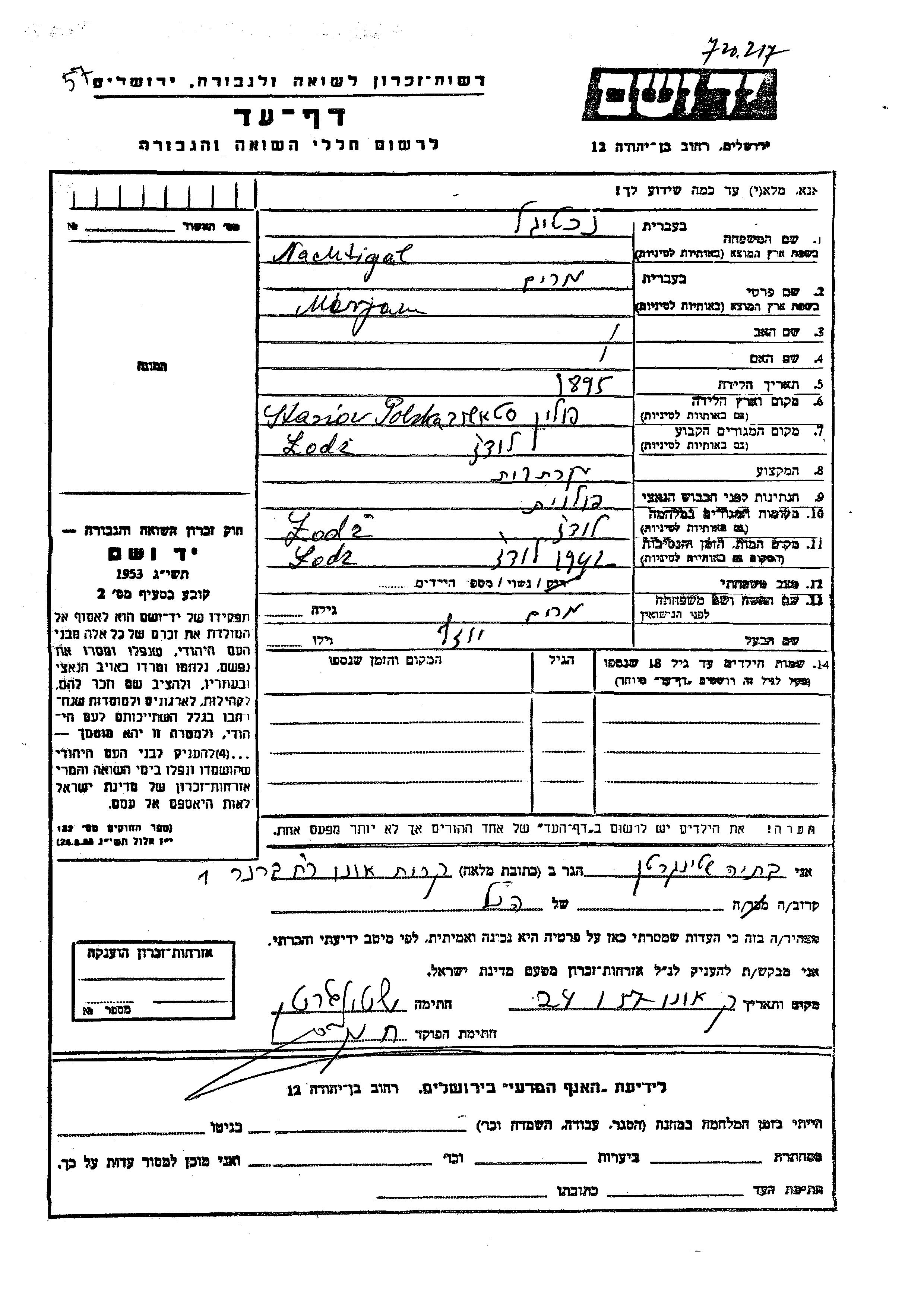 Nachtigal Marjam 1895 Lodz, Polonia Hoja de Testimonio