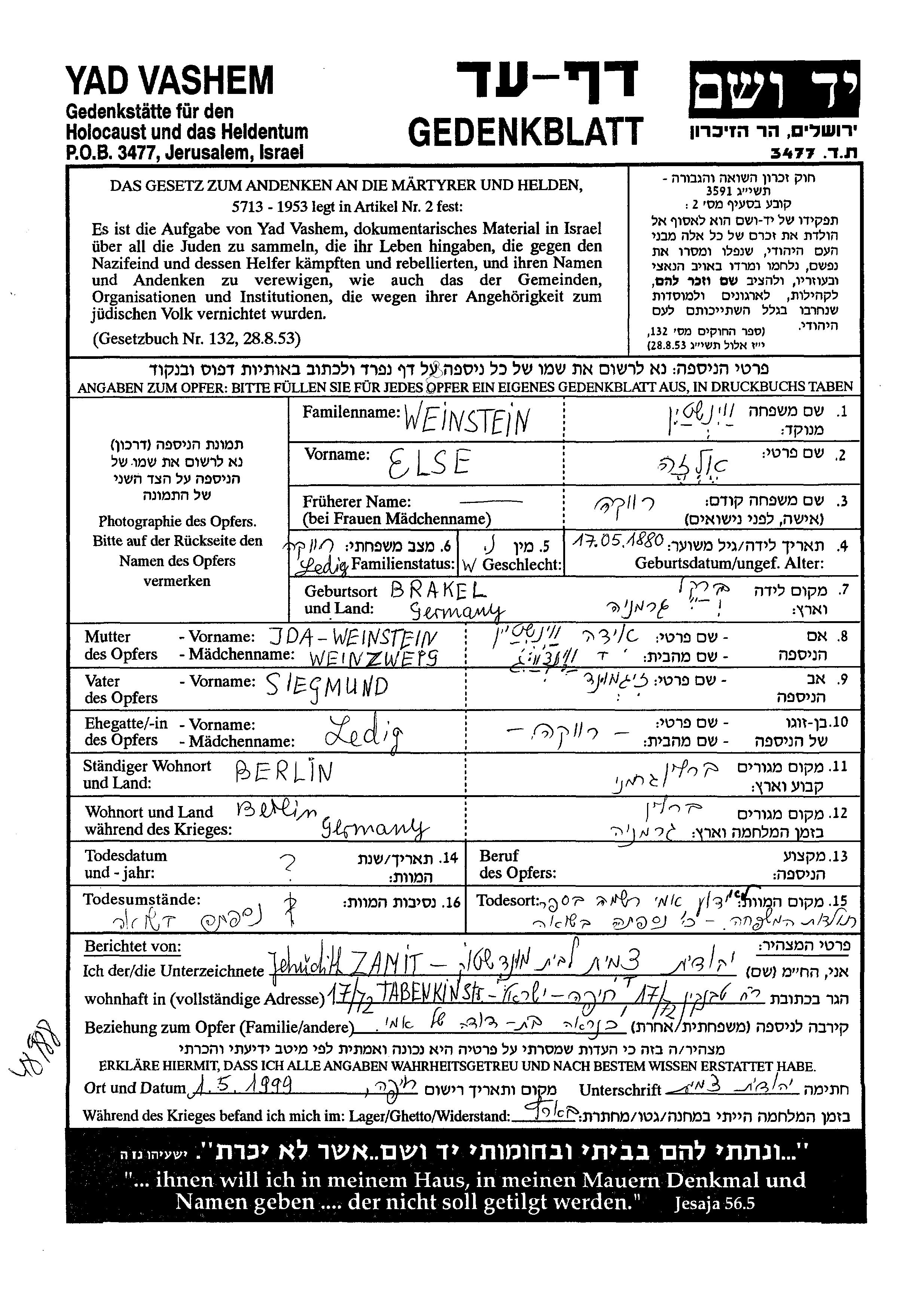 Weinstein Elza 1880 Berlin, Alemania Hoja de Testimonio