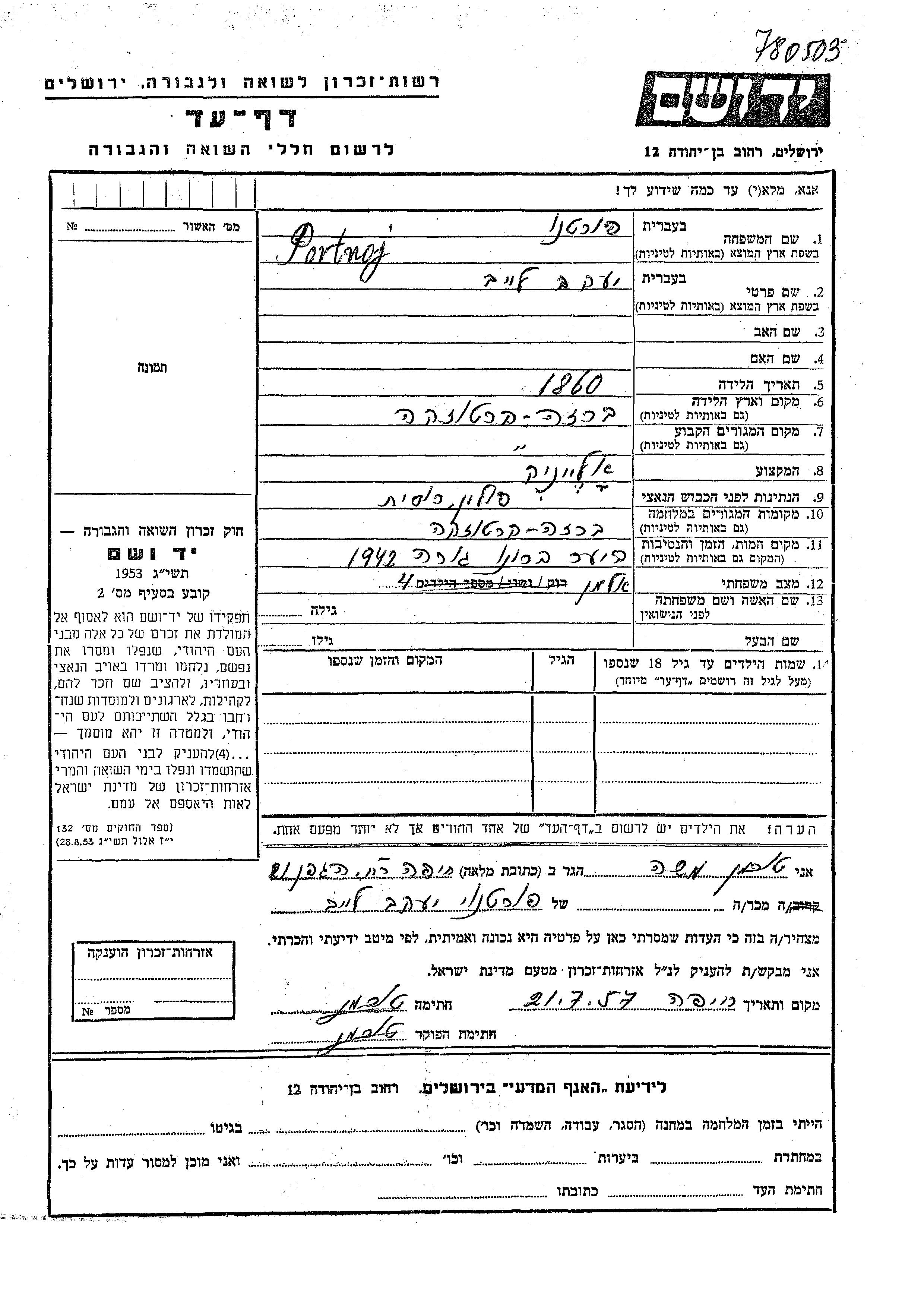Portnoj Porteno Yaakov Leib 1860 Bereza Kartuska, Polonia Hoja de Testimonio