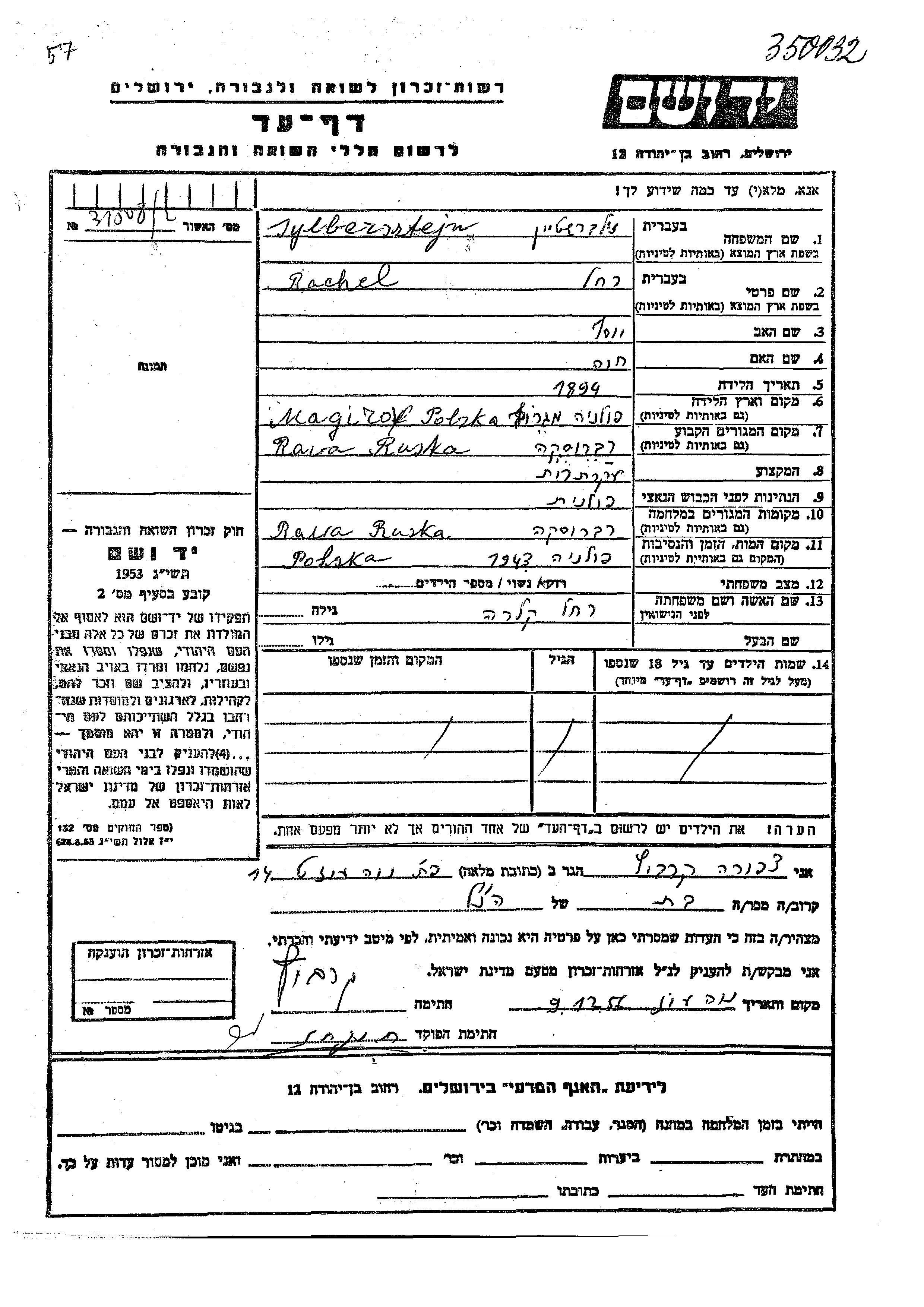 Zylbersztejn Rachel 1894 Rawa Ruska, Polonia Hoja de Testimonio