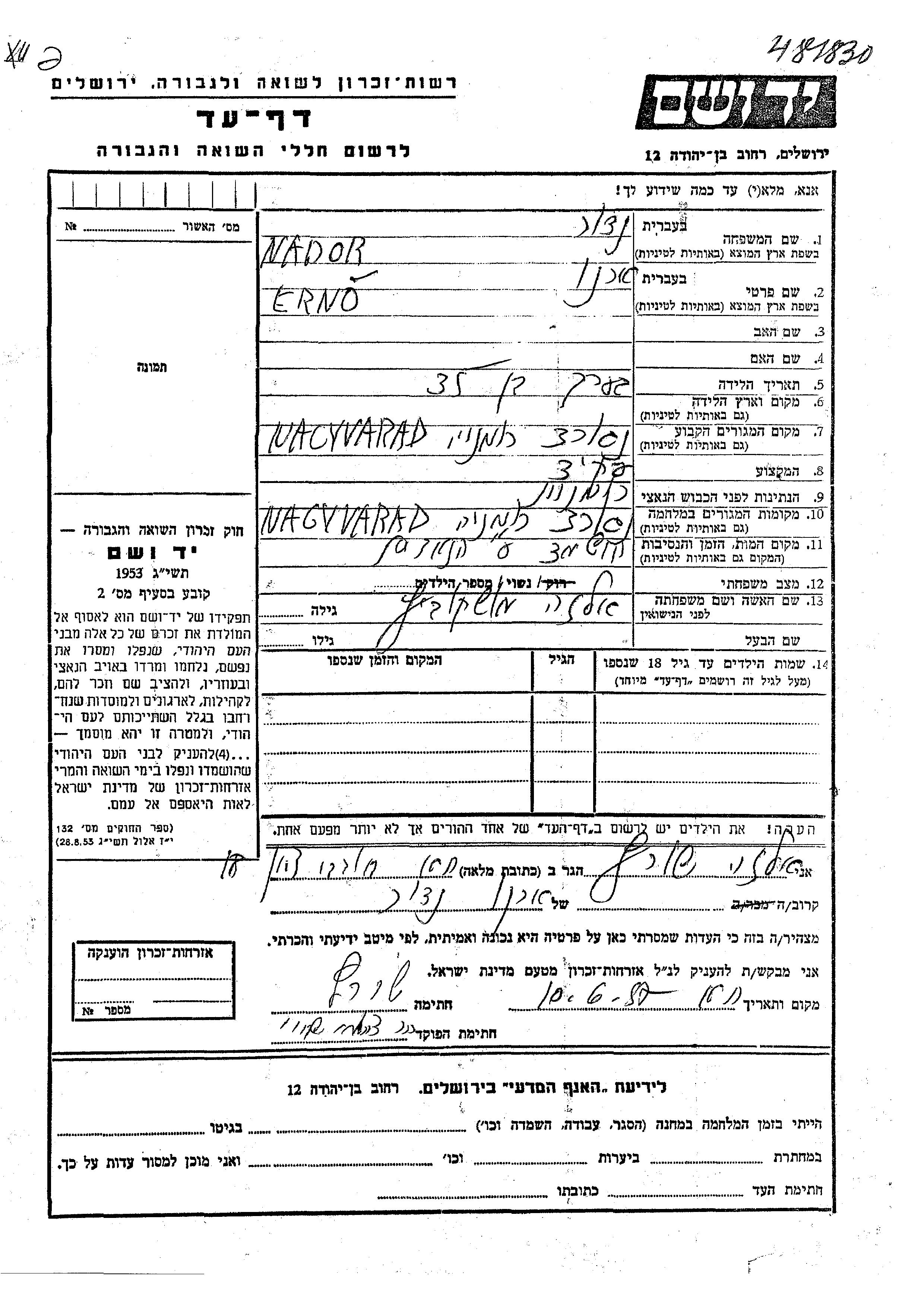 Nador Erno Nagyvarad, Rumania Hoja de Testimonio