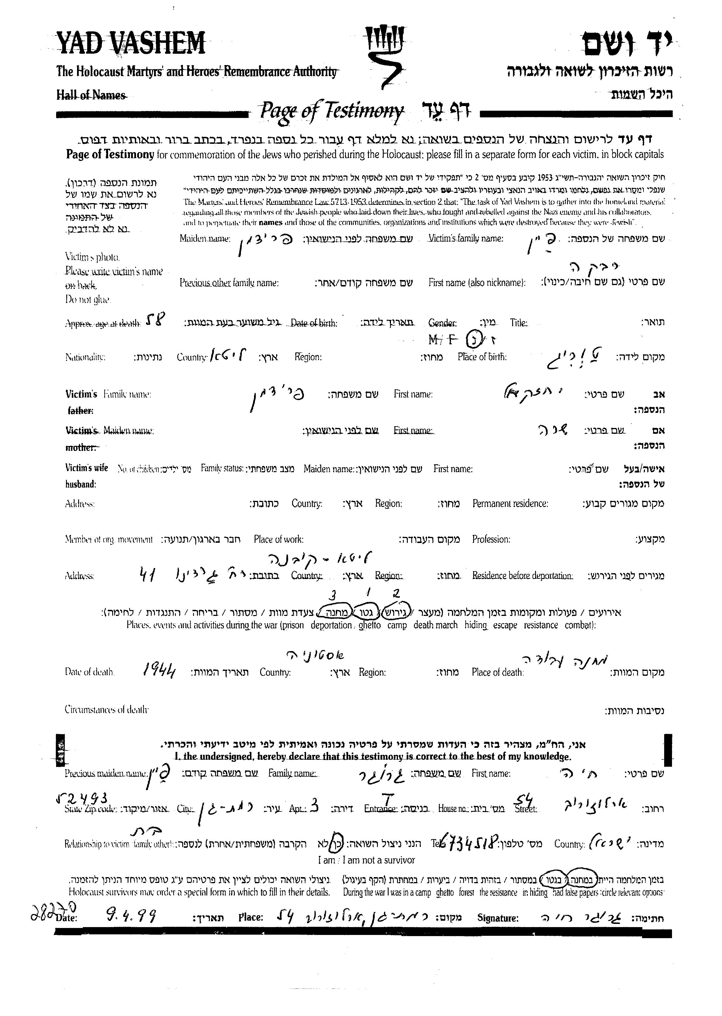 Fein Rivka lugar desconocido, Hoja de Testimonio