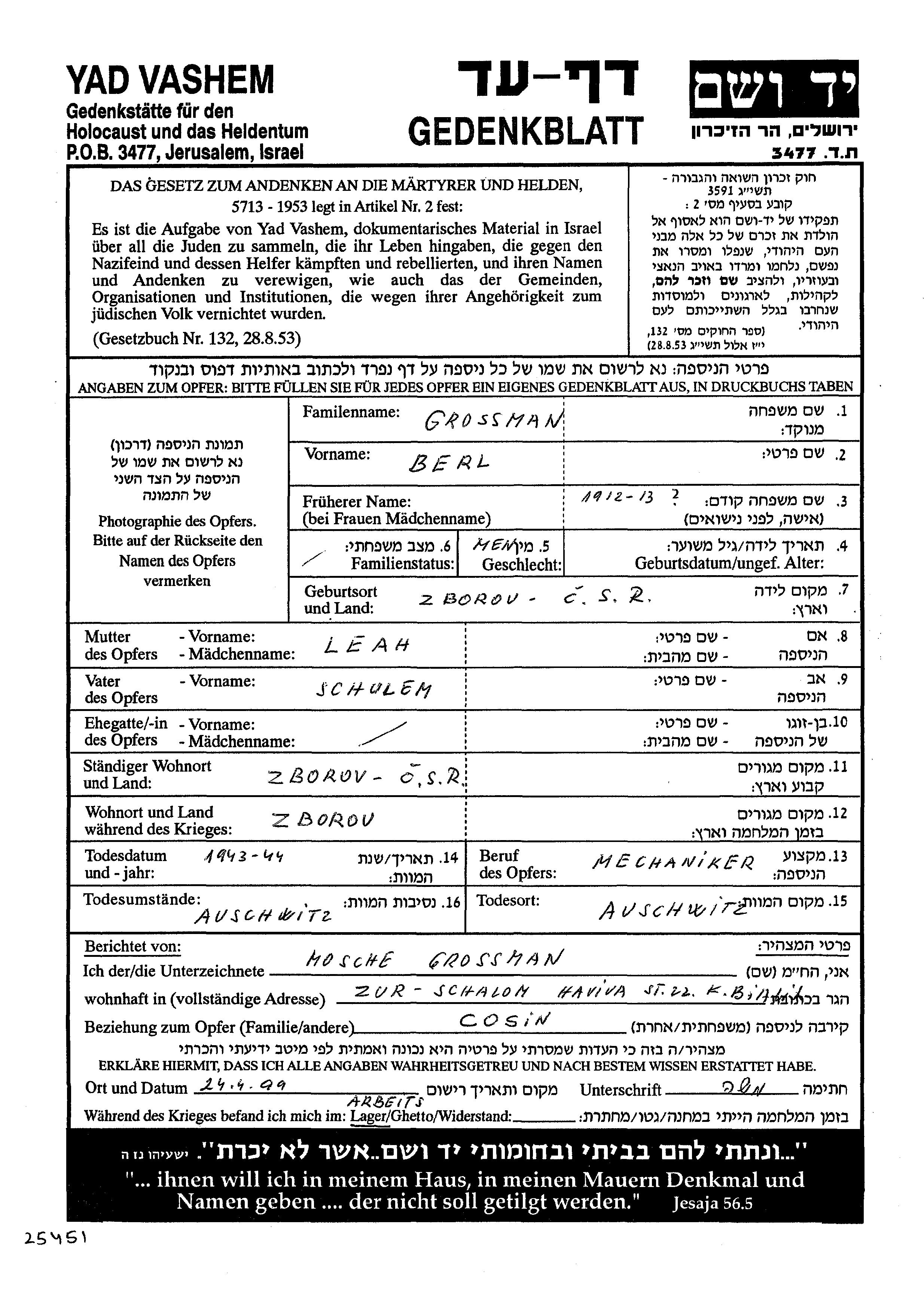 Grossman Berl Zborov, Checoslovaquia Hoja de Testimonio