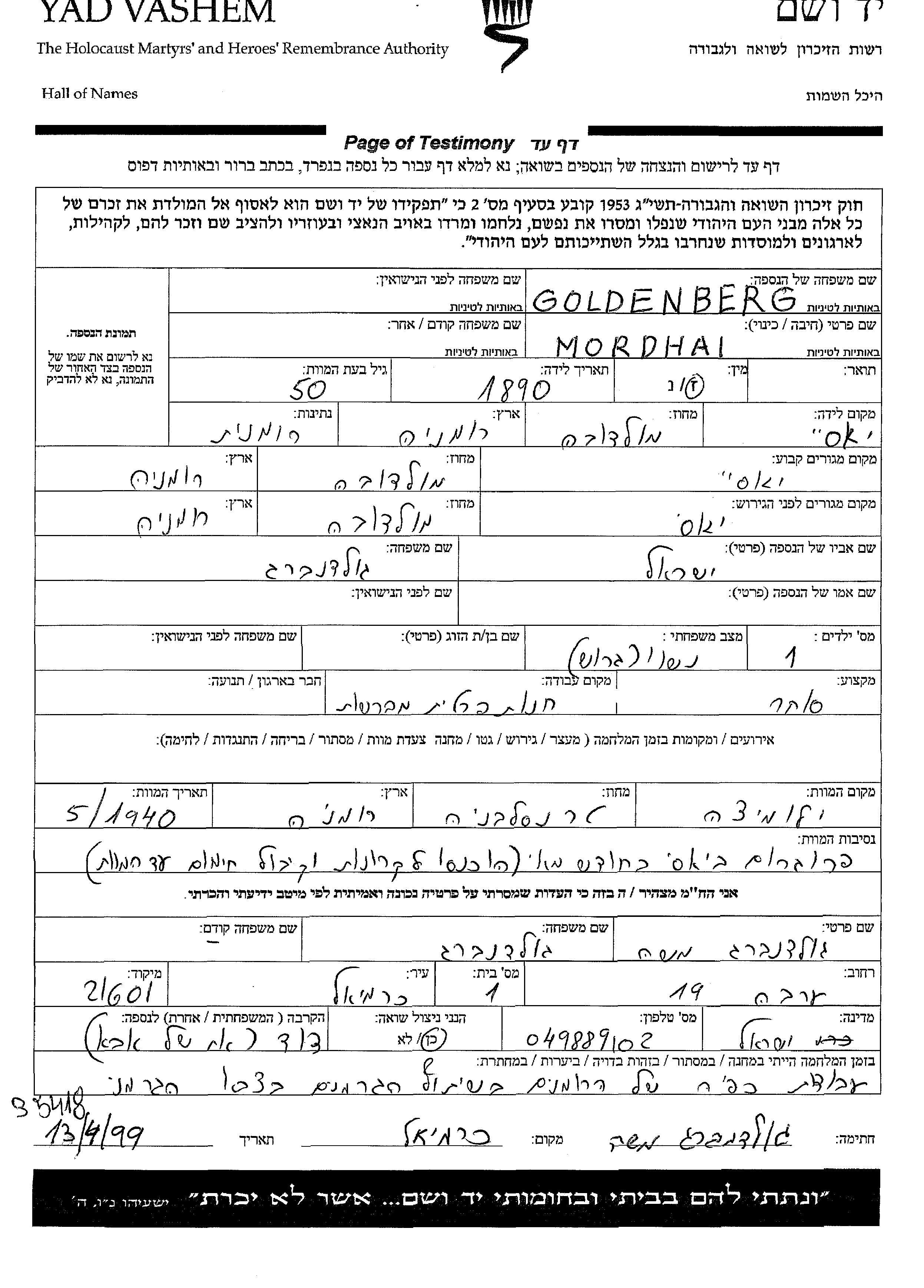Goldenberg Mordhai 1890 Jassy, Rumania Hoja de Testimonio